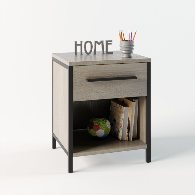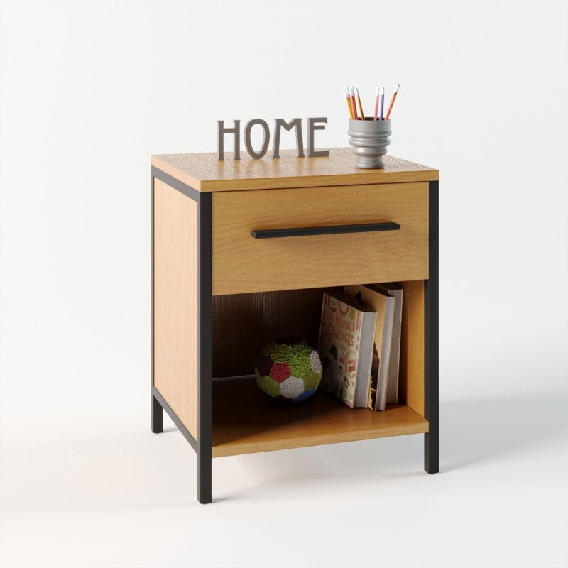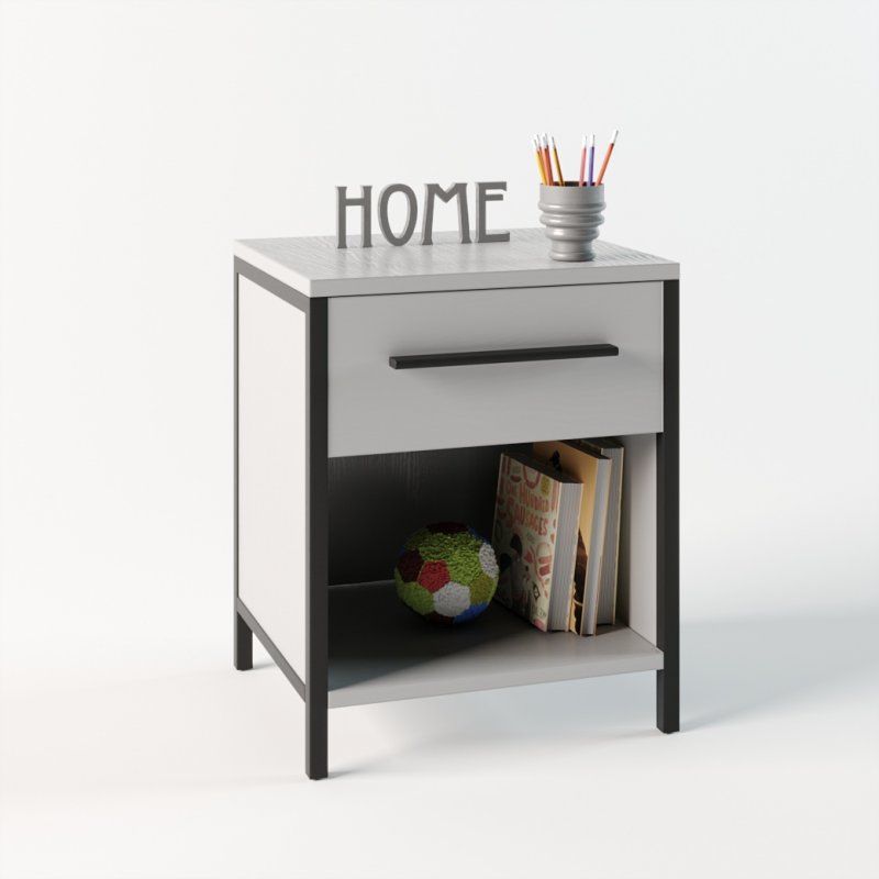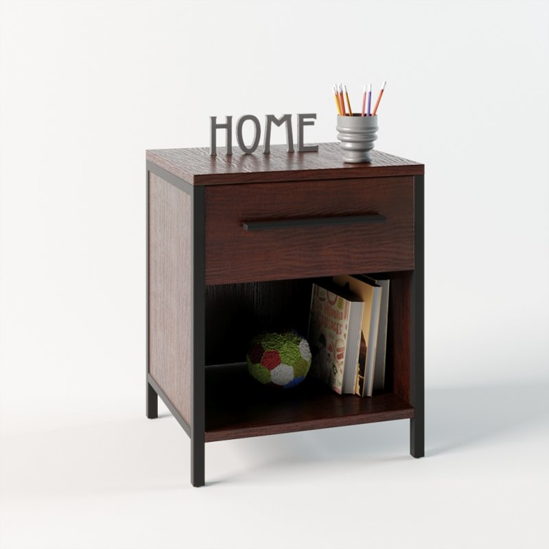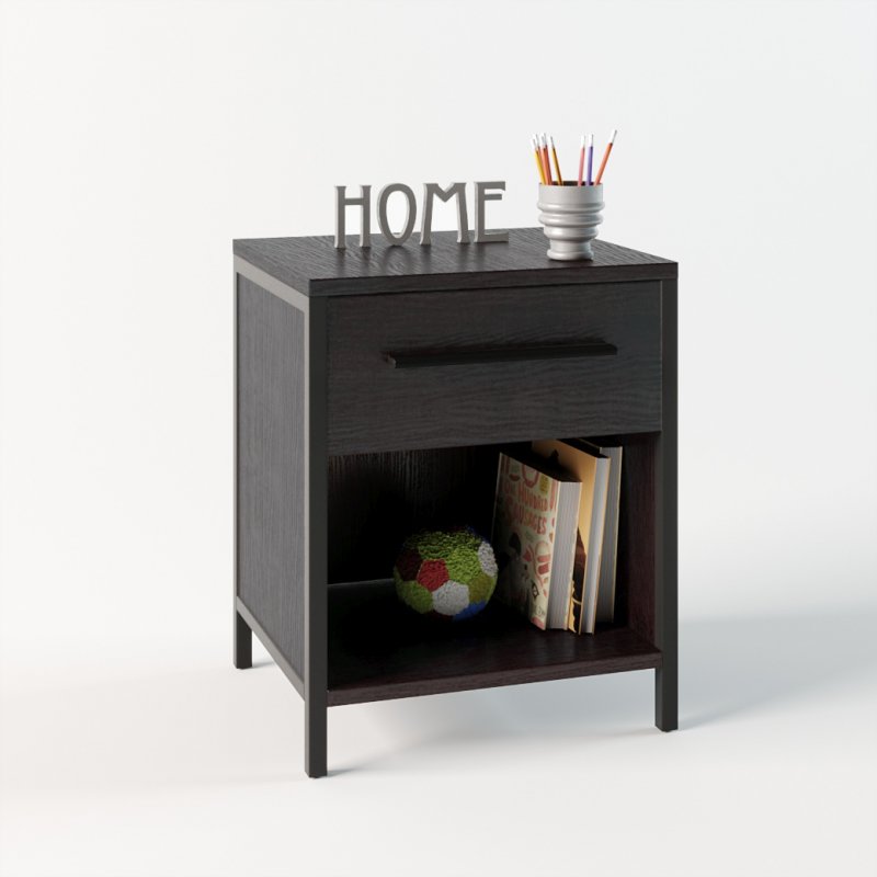Офісна тумба 01 – має міцні металеві ніжки та перемички, пофарбовані термофарбою у чорний колір. Безпосередньо тумба виконана із ДСП товщиною 16 мм. Конструкція являє собою одну висувну скриньку у верхній частині, і відкриту полицю знизу.