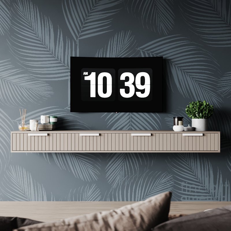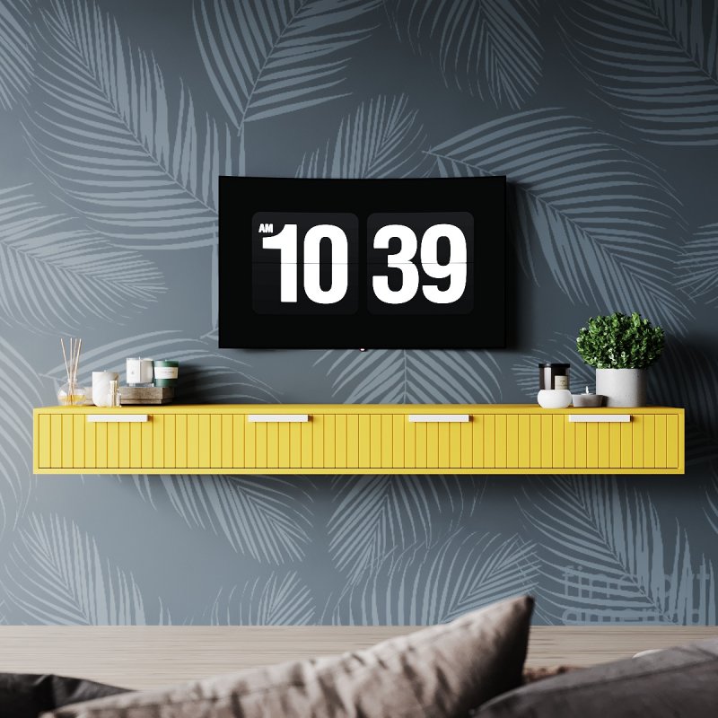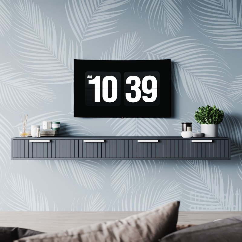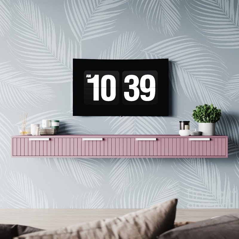 Тумба під тв у стилі лофт кріпиться безпосередньо до стіни, що надає їй легкості та легкості. Підвісна конструкція зручна тим, що висоту установки ви визначаєте самі, залежно від особистих уподобань. Зручні закриті полички дозволяють сховати туди всю необхідну дрібницю від сторонніх очей. А на довгій стільниці вистачить місця для предметів декору, стовпчиків, фотографій або вази з квітами.