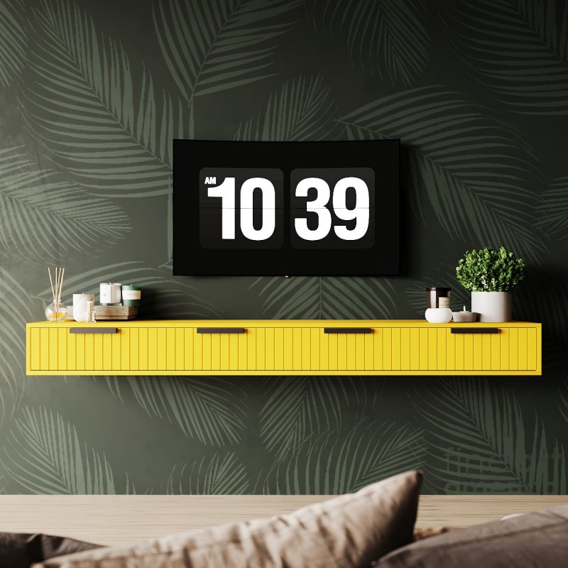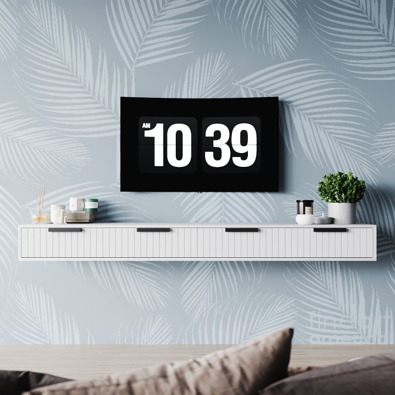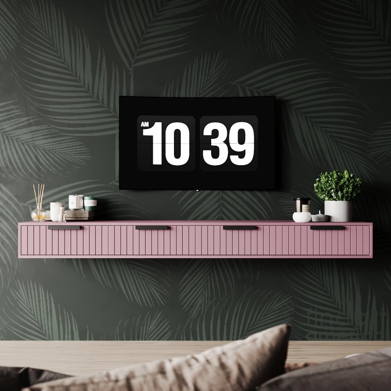 Тумба під тв у стилі лофт кріпиться безпосередньо до стіни, що надає їй легкості та легкості. Підвісна конструкція зручна тим, що висоту установки ви визначаєте самі, залежно від особистих уподобань. Зручні закриті полички дозволяють сховати туди всю необхідну дрібницю від сторонніх очей. А на довгій стільниці вистачить місця для предметів декору, стовпчиків, фотографій або вази з квітами.