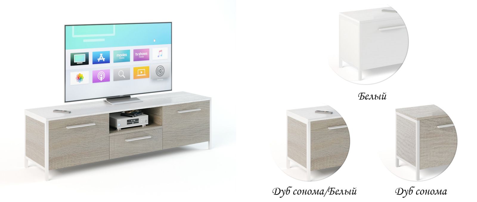 Виріб призначений також для розміщення стерео-або відеосистем, для цього передбачена спеціальна ніша. По обидва боки тумби є два великі ящики з дверцятами. Габаритні розміри підставки (В/Ш/Г): 425 1550 365 мм. Це досить компактна модель, яку можна розмістити під стіною, не займаючи зайву площу.