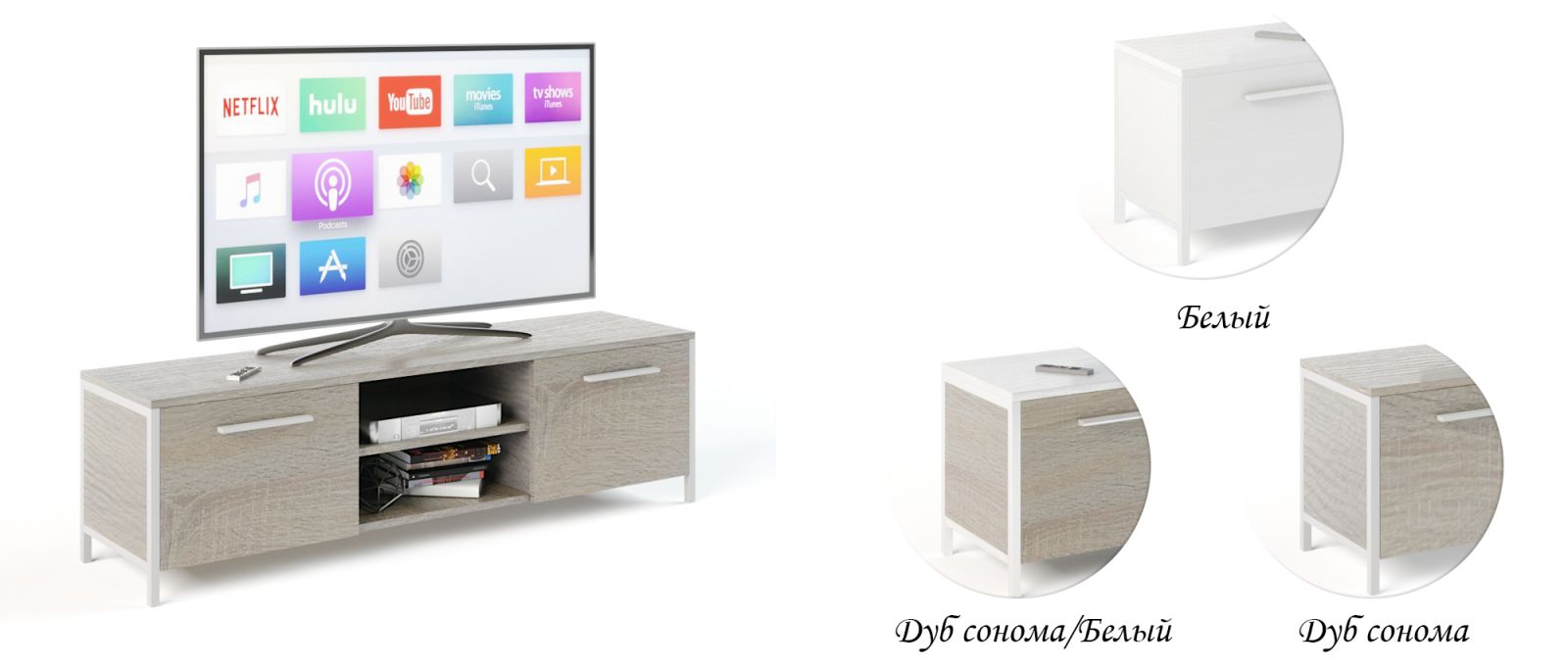 Зручна конструкція тумби передбачає наявність закритих ящиків з боків, а також відкритої ніші із двома полицями по центру. Можете розмістити акустичну систему чи медіаплеєр у ніші, а інші побутові дрібниці сховати від стороннього погляду за дверцятами.