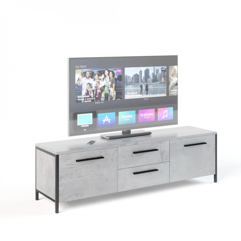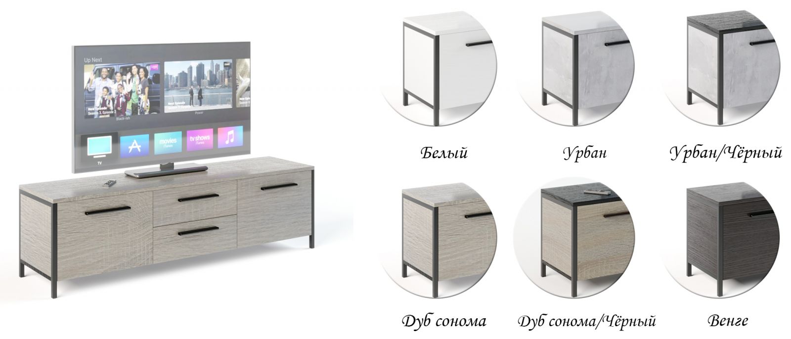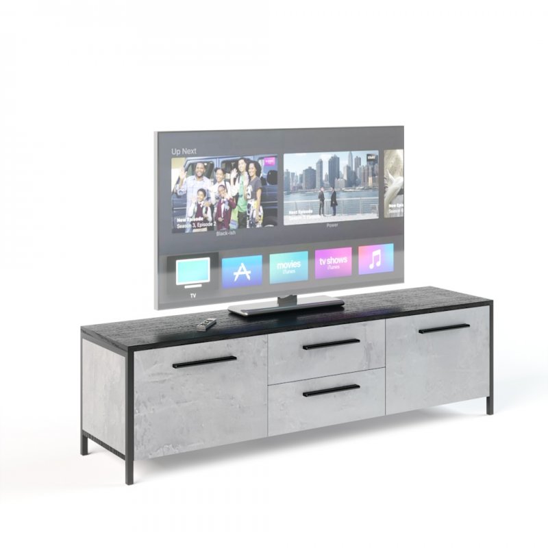 Оптимальні габаритні розміри виробу (В/Ш/Г) 425×1550×365 мм дозволяють використовувати тумбу як підставку для великого плазмового телевізора або іншої аудіо- чи відеотехніки. Конструкція моделі складається з металевих стійок-ніжок, виконаних із труби квадратного перерізу зі стороною 20 мм. Сама тумба виконана з якісного та екологічно безпечного ДСП, що має кілька варіантів текстури: венге, дуб сонома, урбан або їх комбінацій.