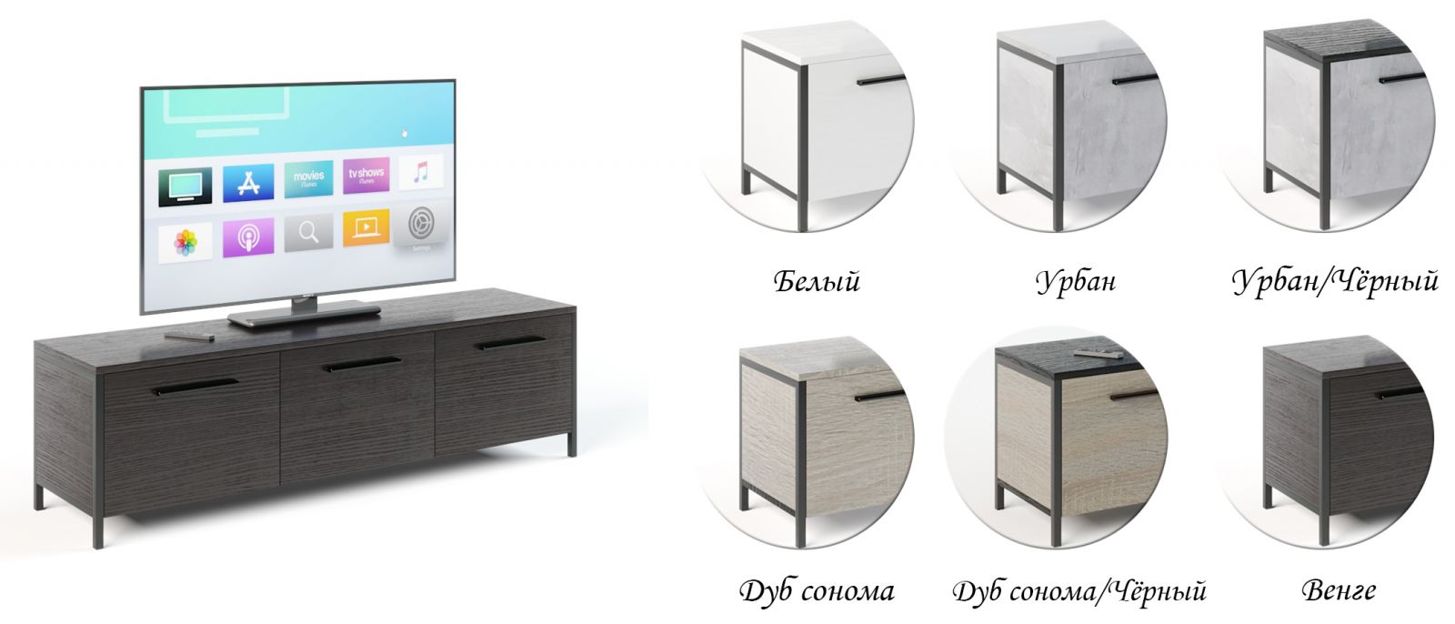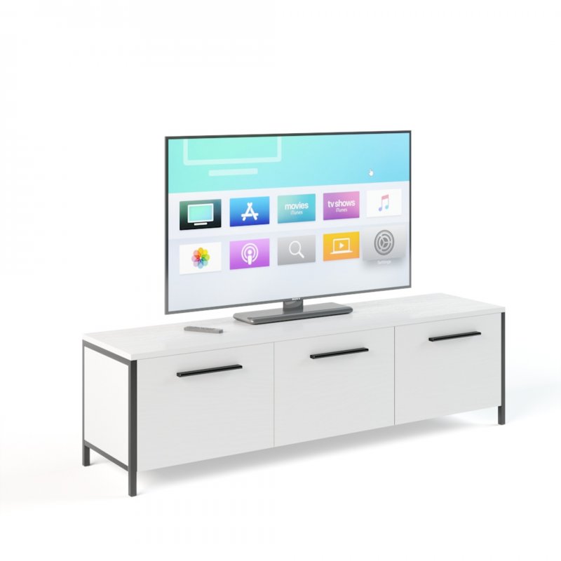 Тумба може виконувати роль постачання під телевізор або іншу техніку, або стати просто частиною меблів для зберігання побутових дрібниць. Модель фіксується на металевих стійках, виконаних із порожнистої труби квадратного перерізу зі стороною 20 мм. Поверхня ніжок покрита порошковою фарбою чорного кольору з метою надання стильного зовнішнього вигляду, захисту виробу від вологи, пилу та побутових пошкоджень.