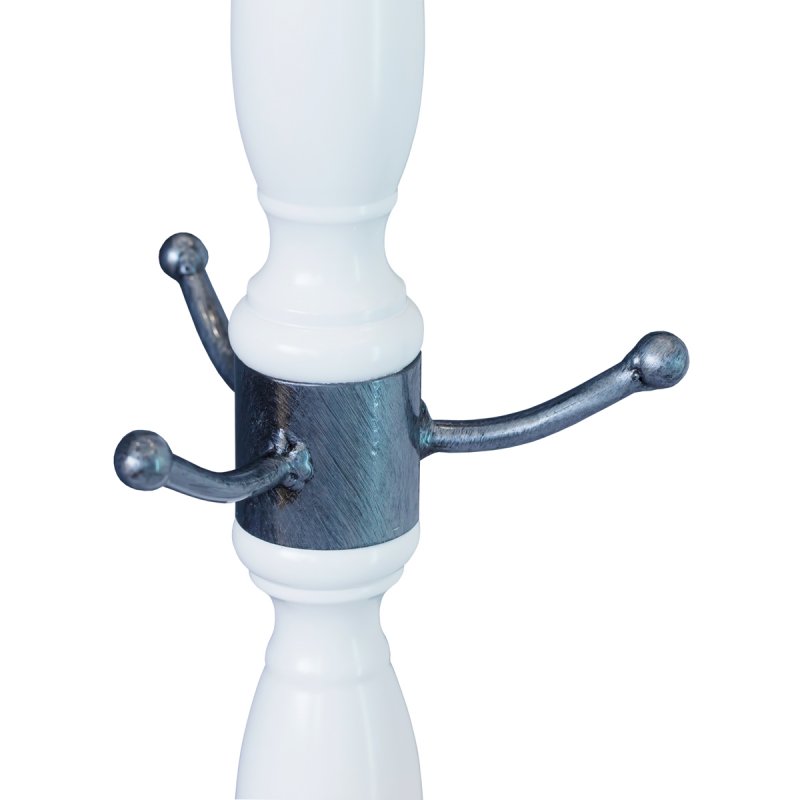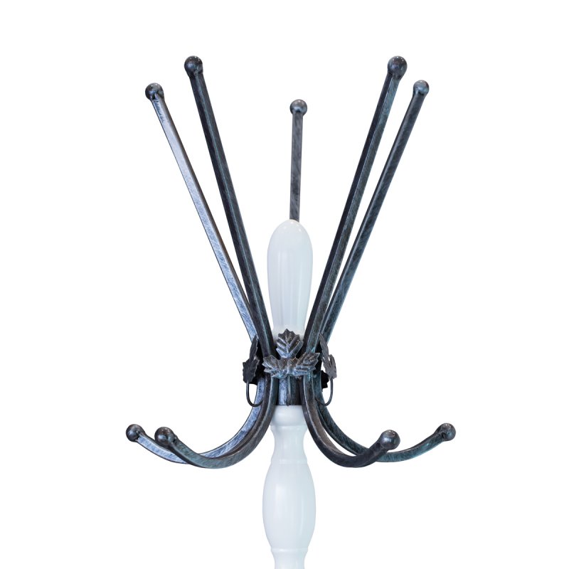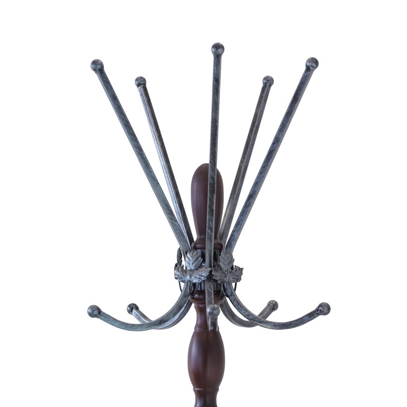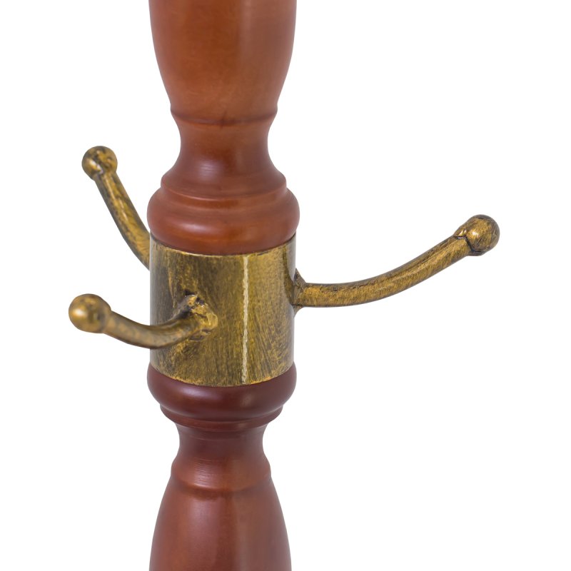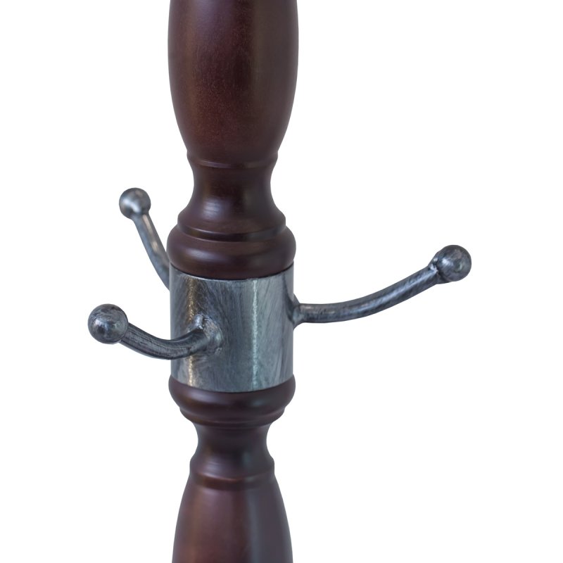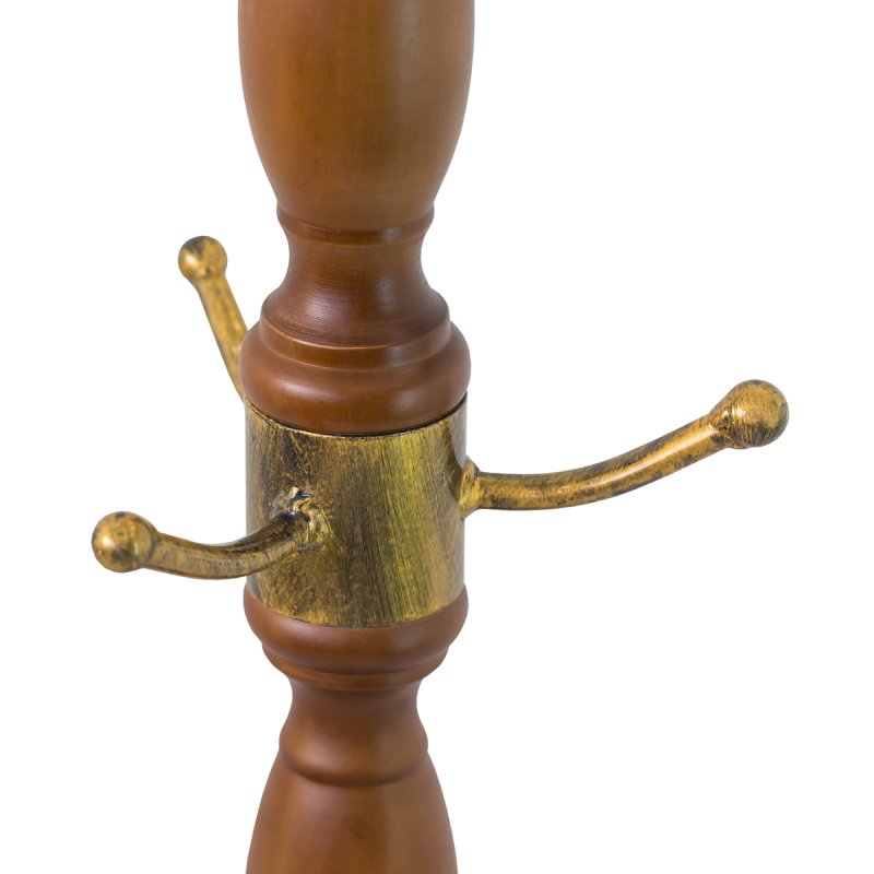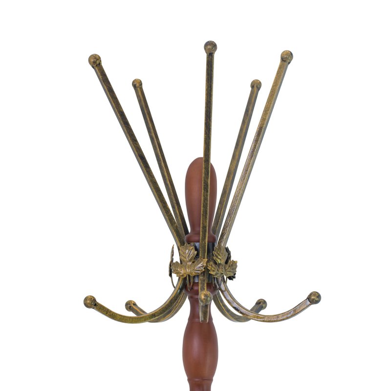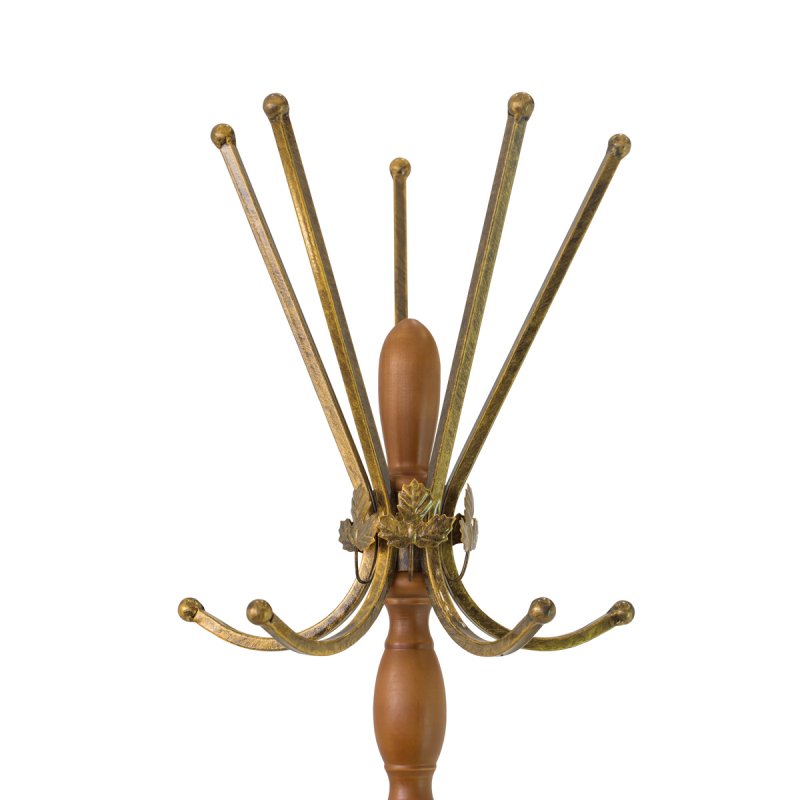 Ковані металеві ріжки забарвлені порошковим методом. На них завдано ефекту патини золотистою фарбою. За рахунок цього дерев'яна вішалка для підлоги має благородний зовнішній вигляд, дуже зручна і надійна в експлуатації.