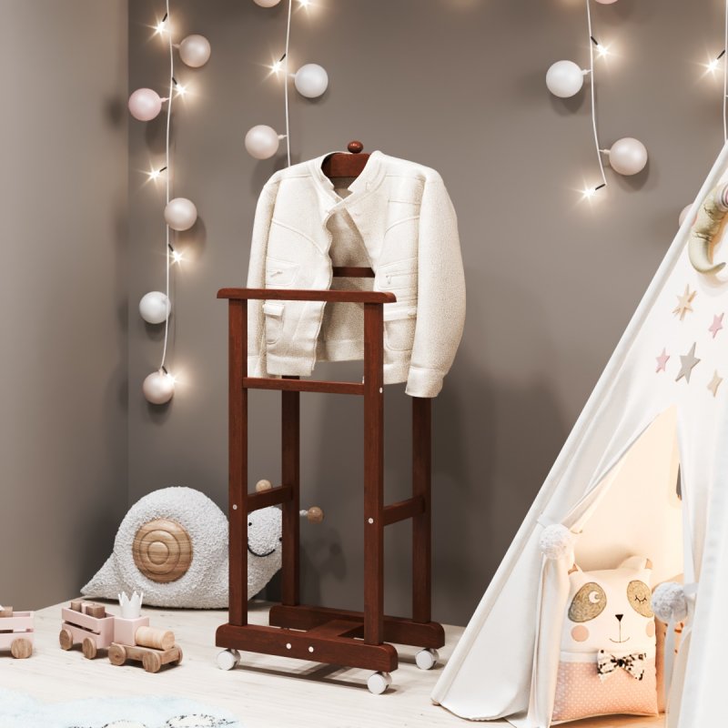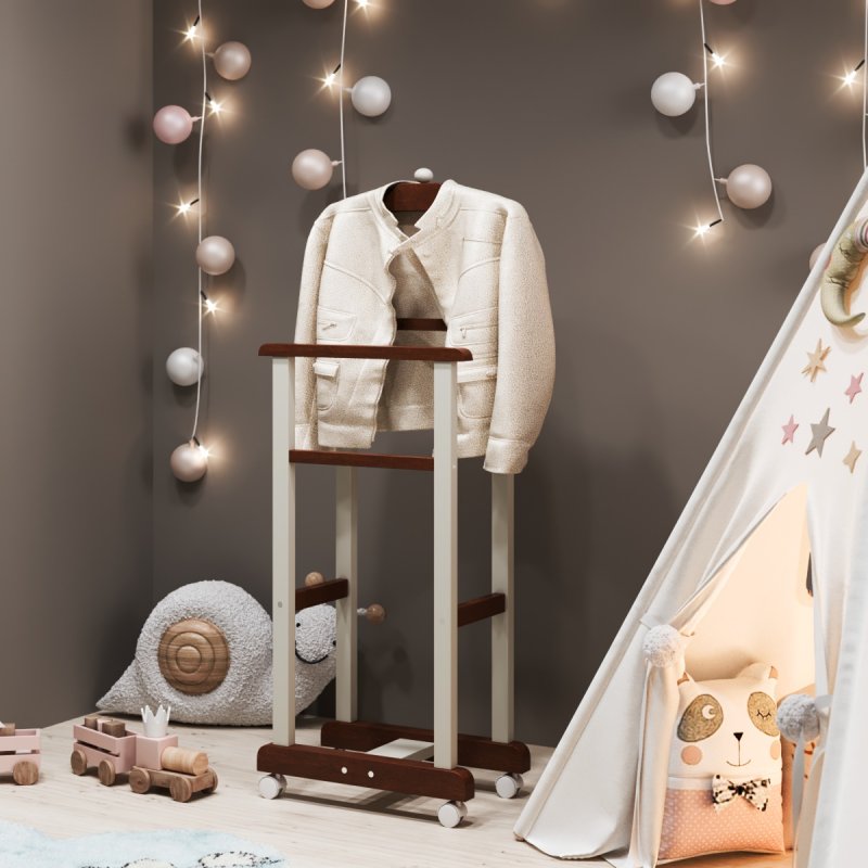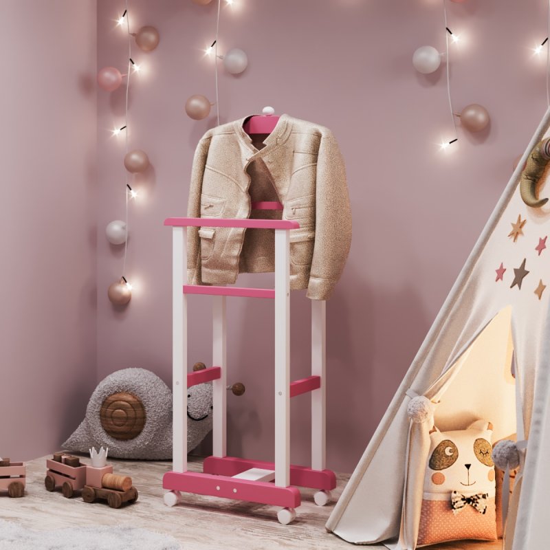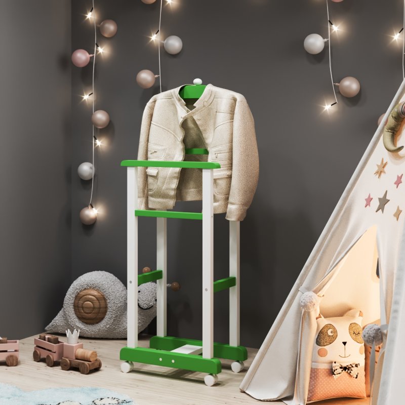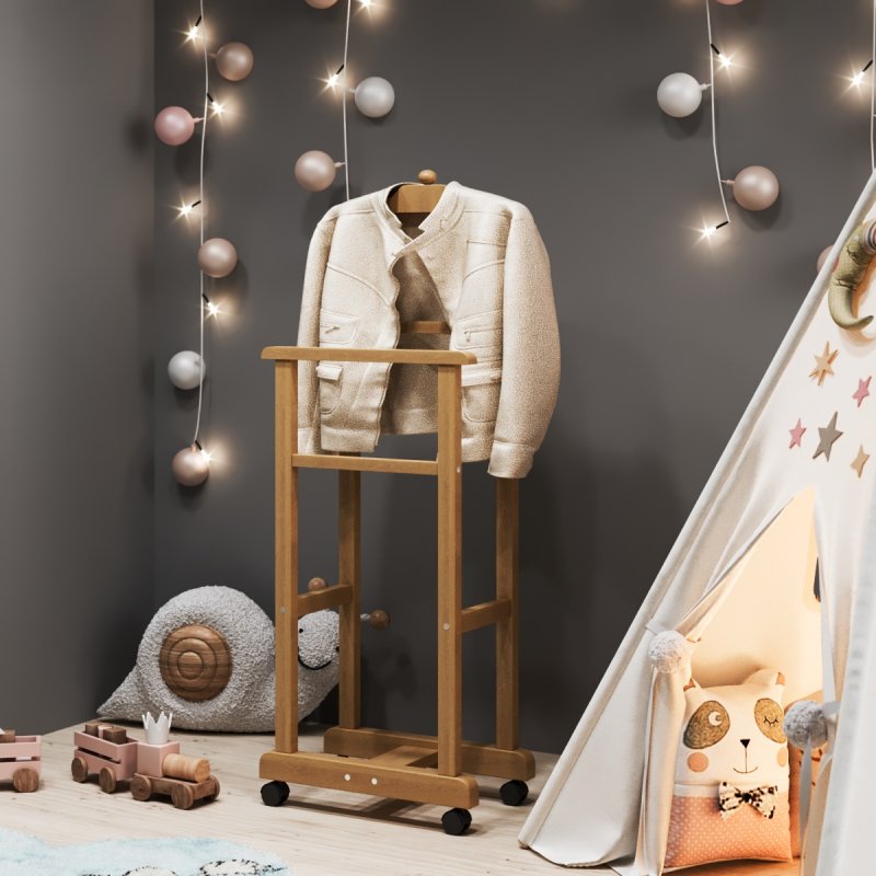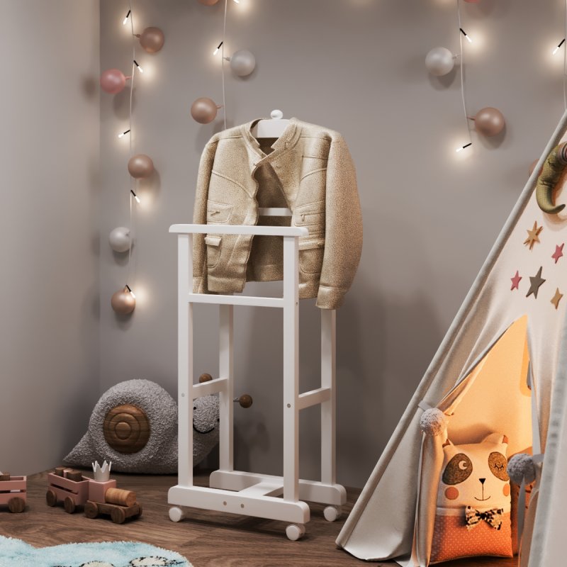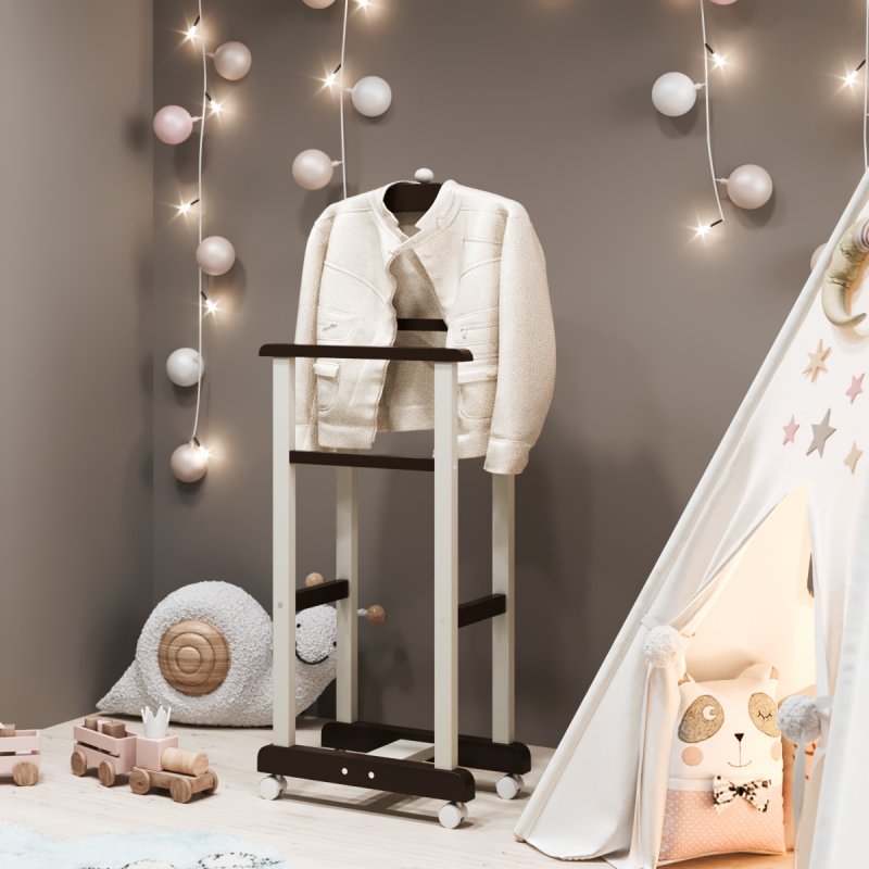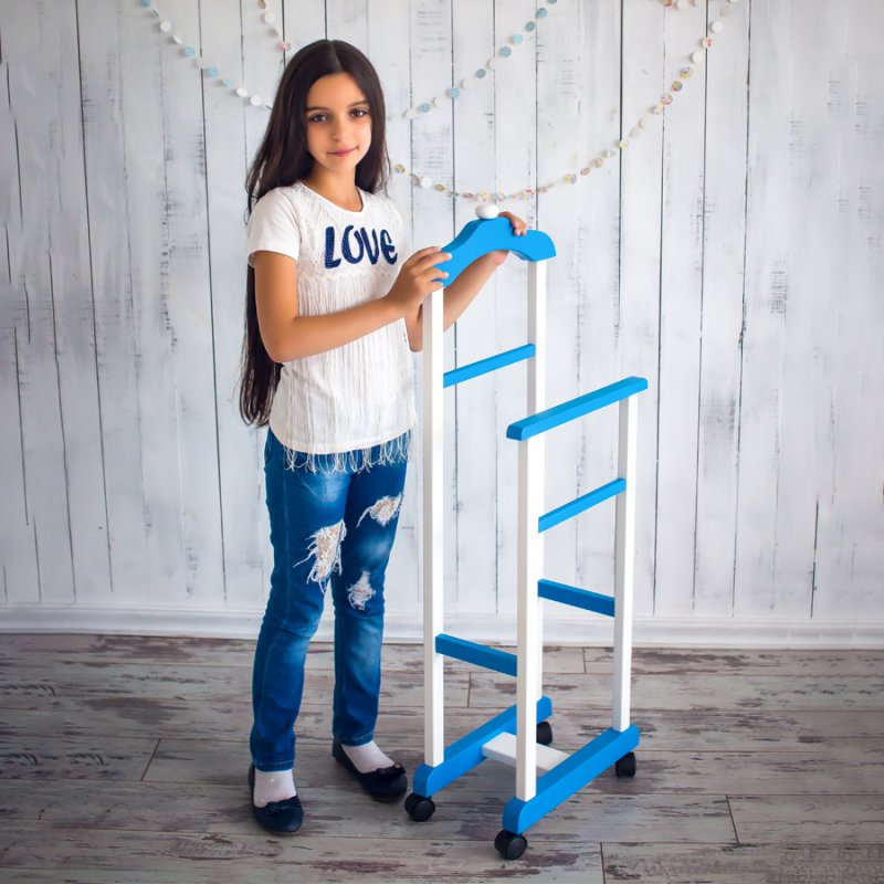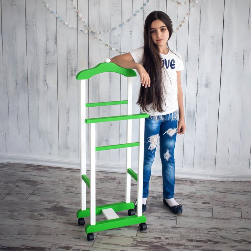 Дитяча підлогова стійка «Крихітка» характеризується надійністю та якістю. Дитина із задоволенням використовуватиме таку приємну річ, звикаючи залишати свій одяг у строго відведеному для неї місці. Верхня поперечина стійки виготовлена у формі плічок, дозволяючи зручніше розміщувати одяг. Стійка встановлюється на спеціальні коліщатка, завдяки чому її можна легко пересувати в різних напрямках, з чим впорається навіть найменша "крихітка".