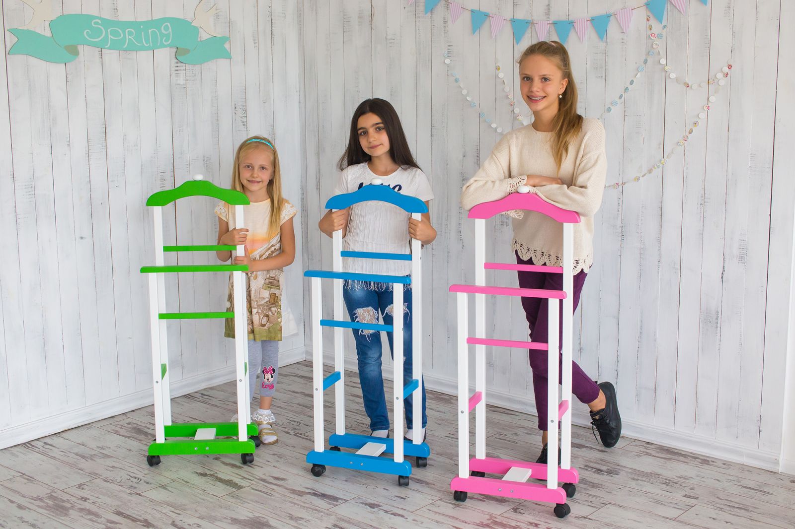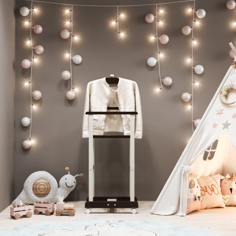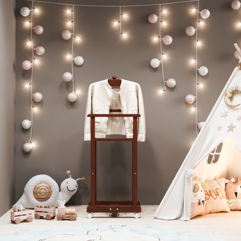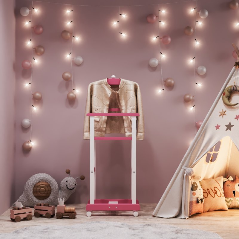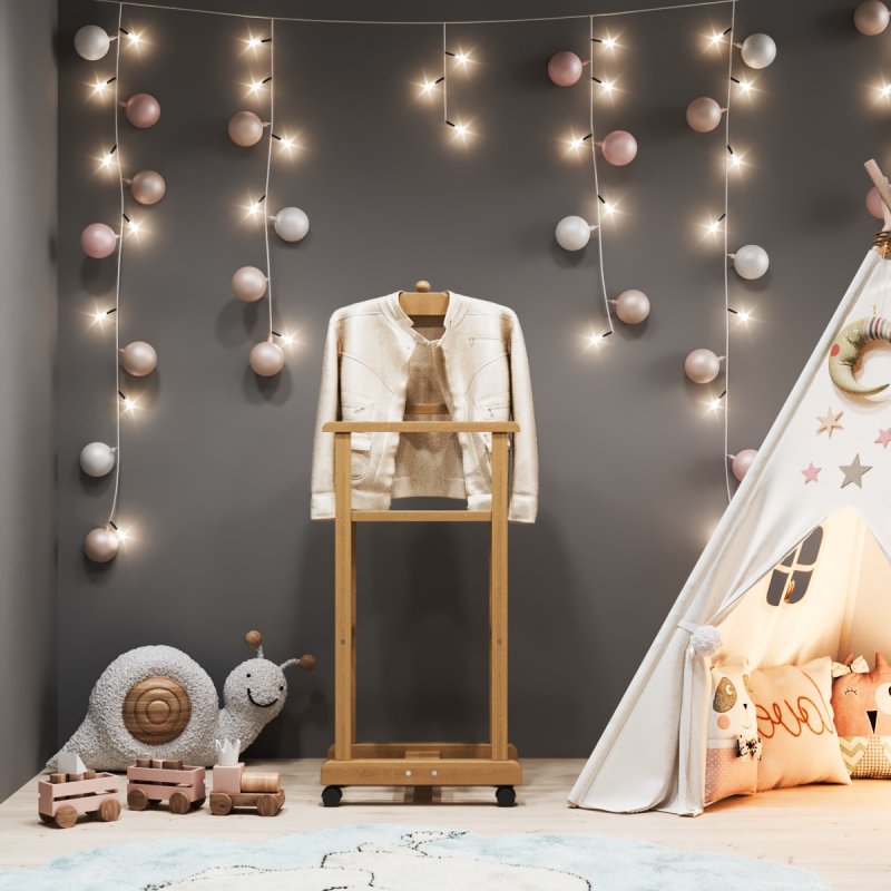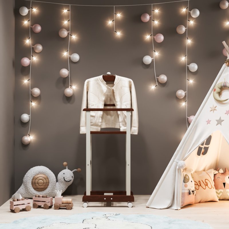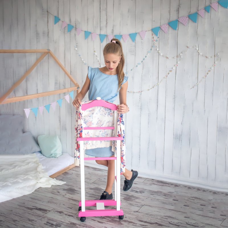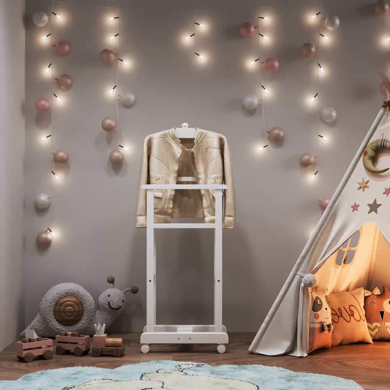 Дитяча підлогова стійка «Крихітка» характеризується надійністю та якістю. Дитина із задоволенням використовуватиме таку приємну річ, звикаючи залишати свій одяг у строго відведеному для неї місці. Верхня поперечина стійки виготовлена у формі плічок, дозволяючи зручніше розміщувати одяг. Стійка встановлюється на спеціальні коліщатка, завдяки чому її можна легко пересувати в різних напрямках, з чим впорається навіть найменша "крихітка".