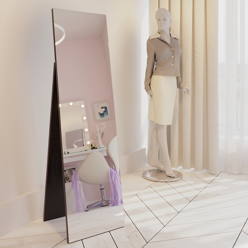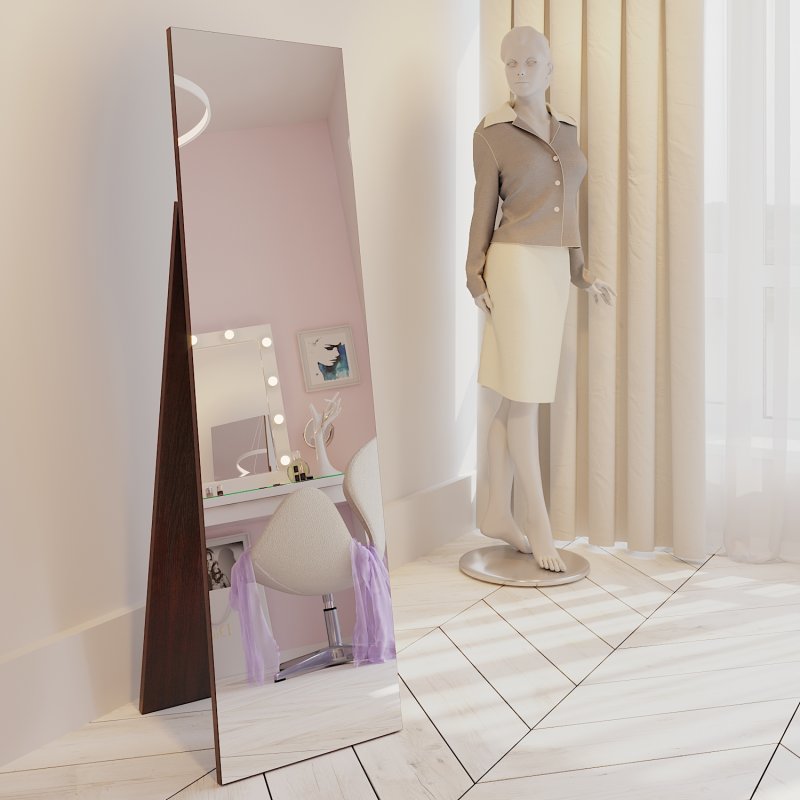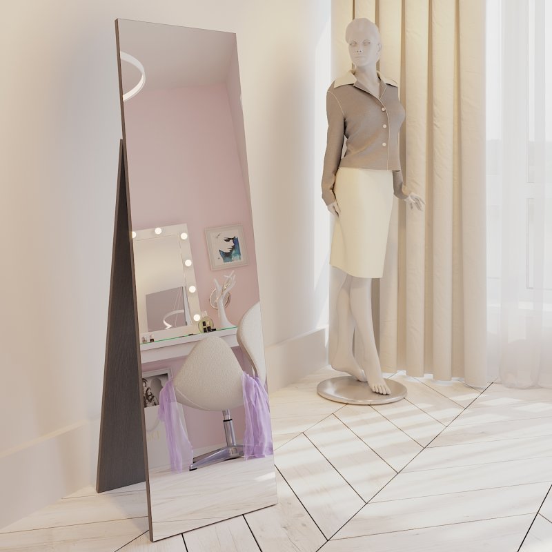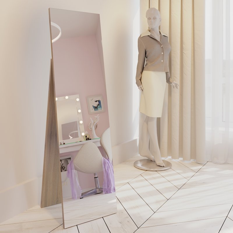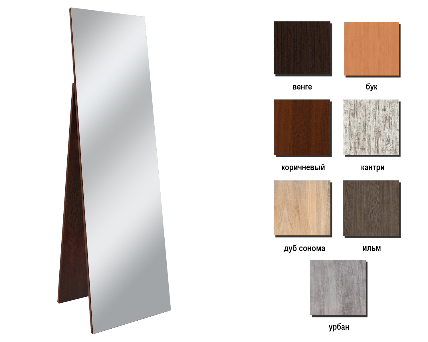 Основа дзеркала виготовлена з якісного та безпечного ДСП, представленого у наступних варіантах кольору: кантрі, бук, дуб сонома, урбан, коричневий, ільм та венге. З тильного боку є міцна ніжка ДСП, яка надійно фіксується до дзеркала за допомогою ланцюжка. Основною перевагою підлогового дзеркала є компактність і мобільність - ви можете переставити виріб при необхідності, воно не займає багато місця.