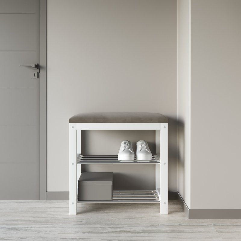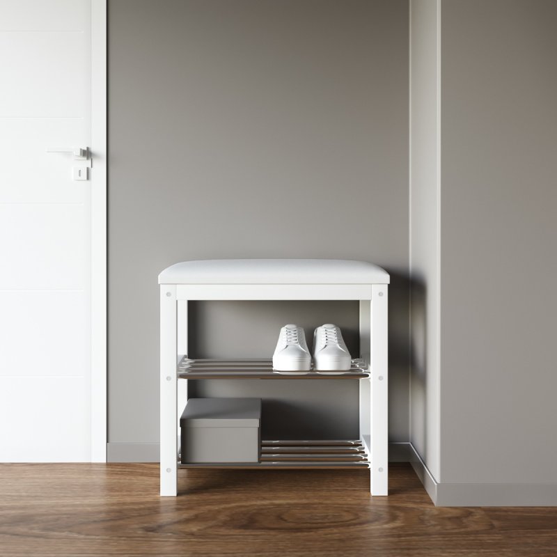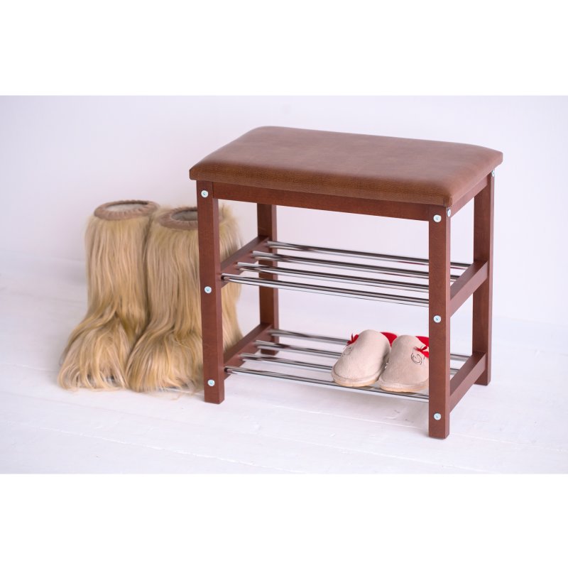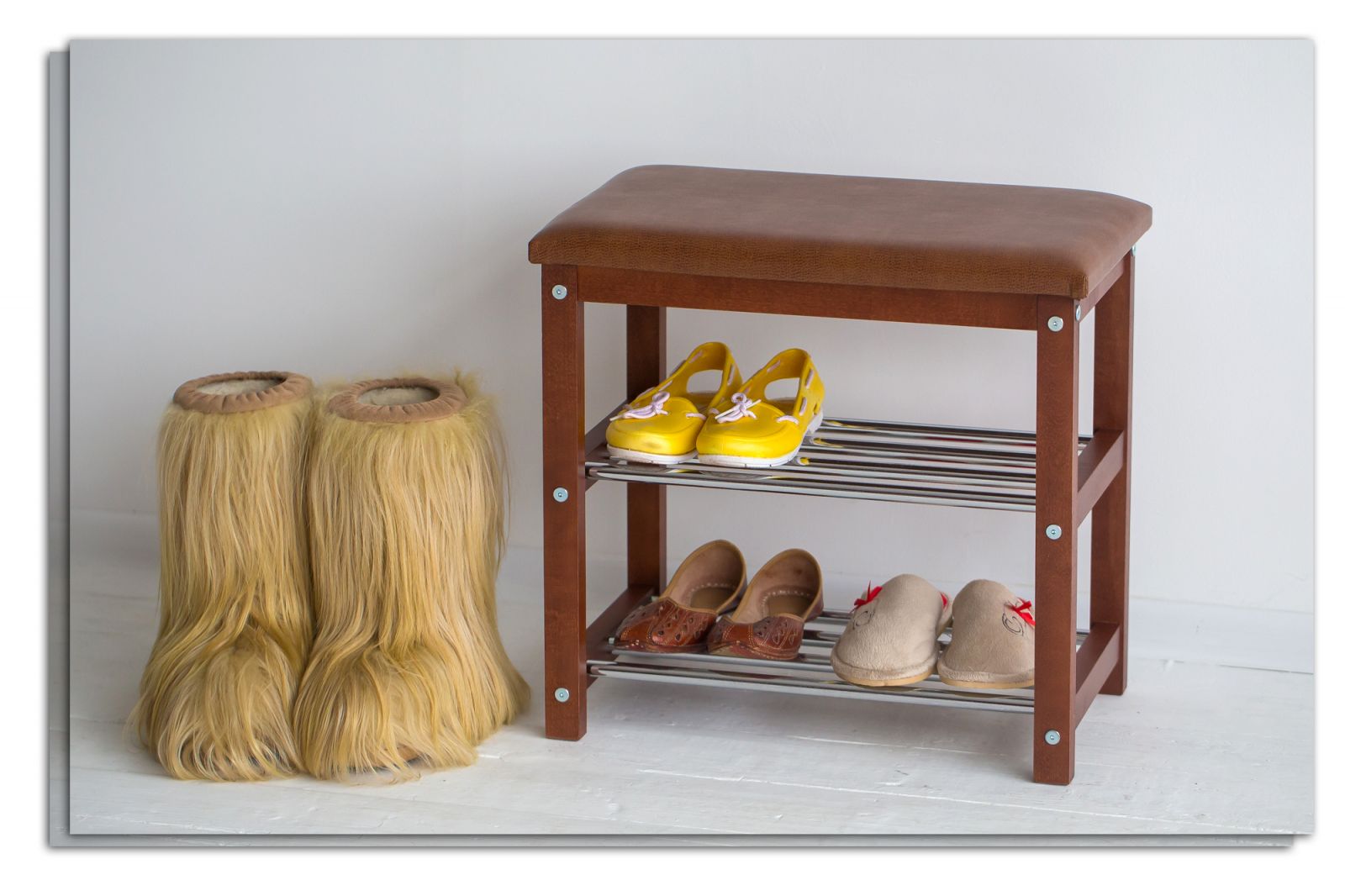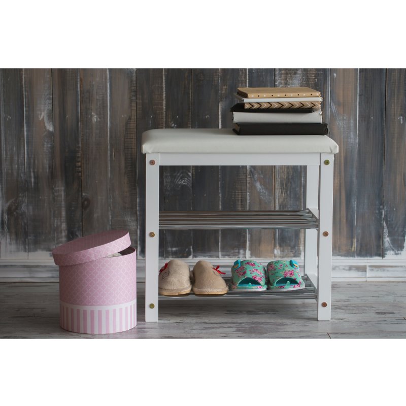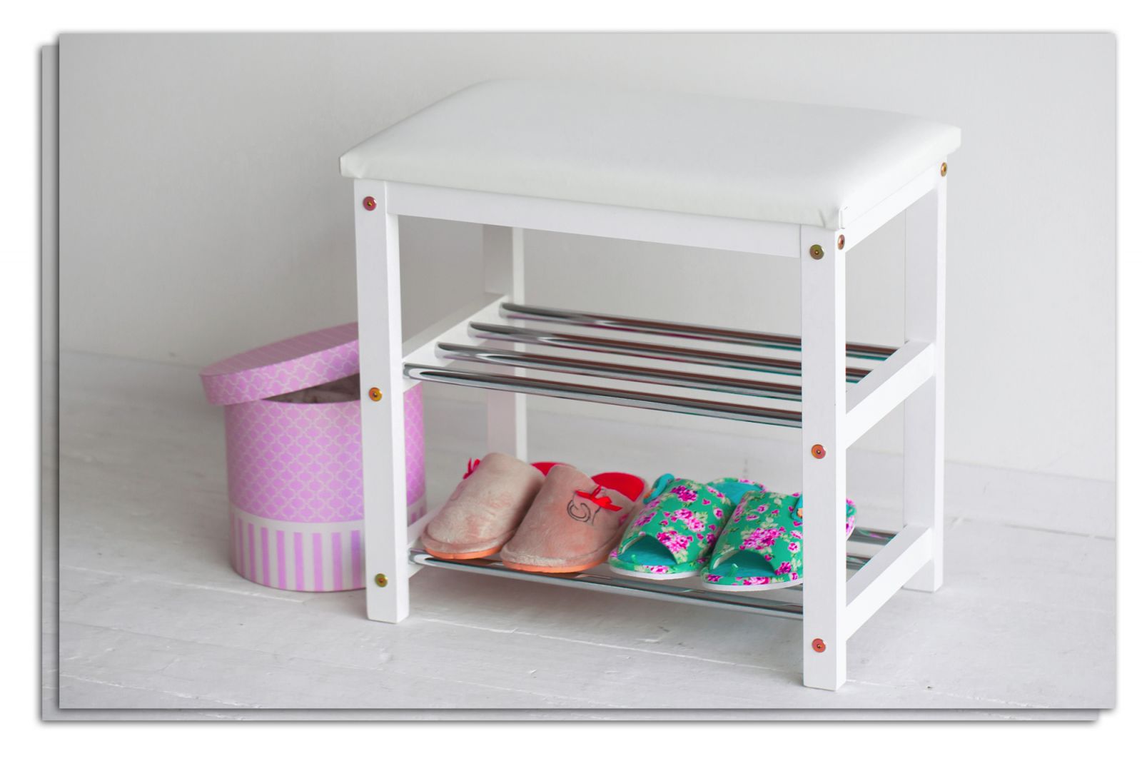 Главное, чем интересна такая банкетка для обуви с полкой – компактность. Благодаря негабаритным размерам, запросто вписывается в малые проемы, ниши и идеально – в небольшую прихожую. Две открытые полки вмещают до 6 пар сапог и туфель.