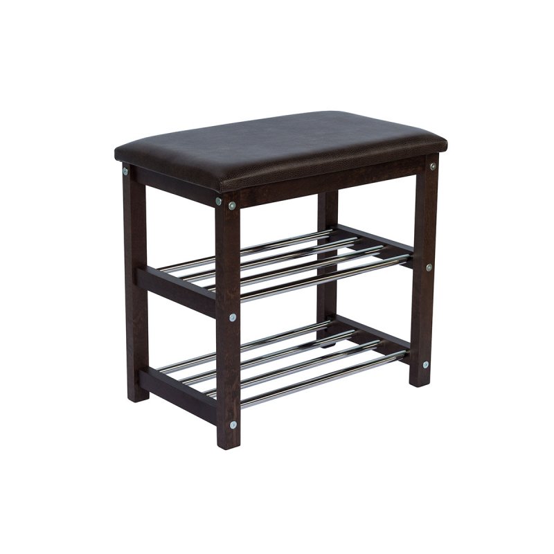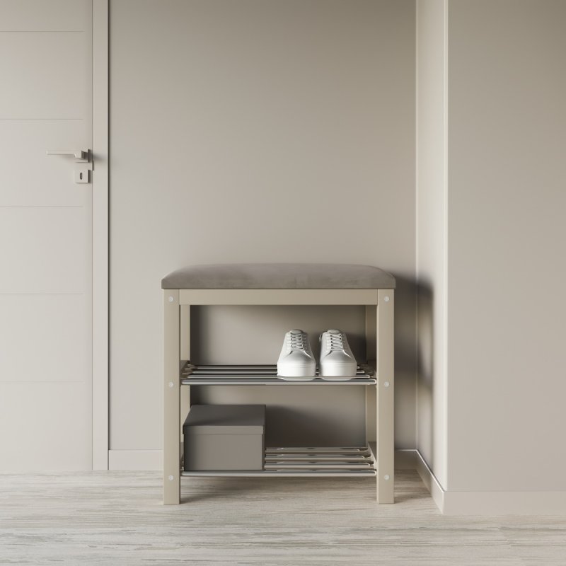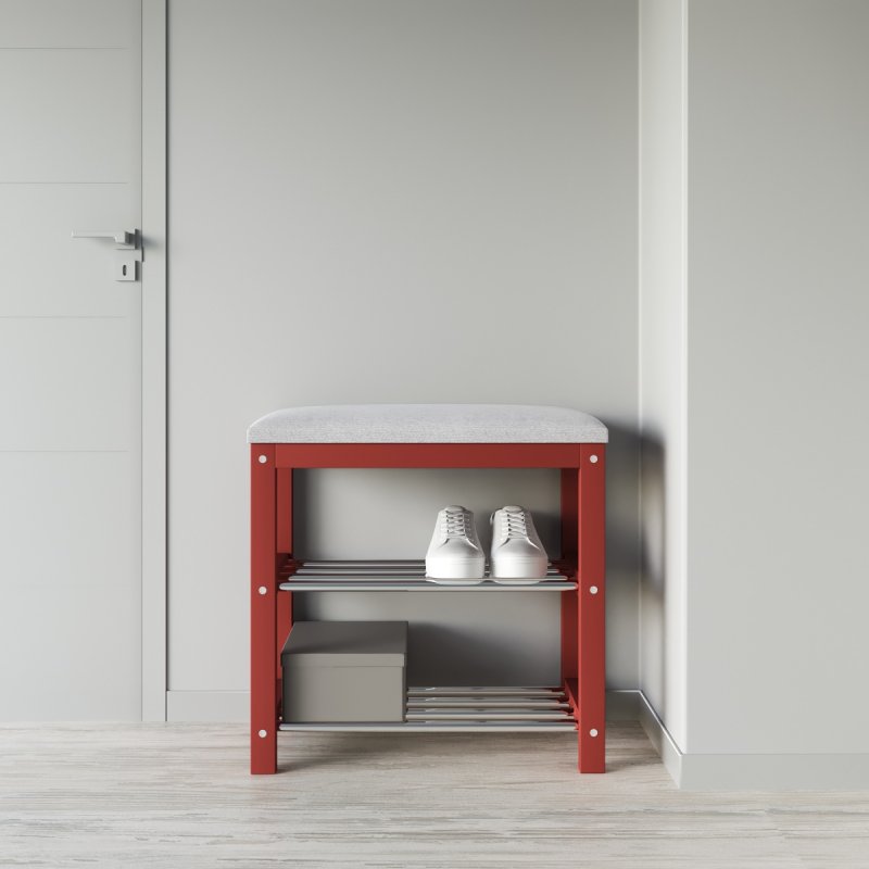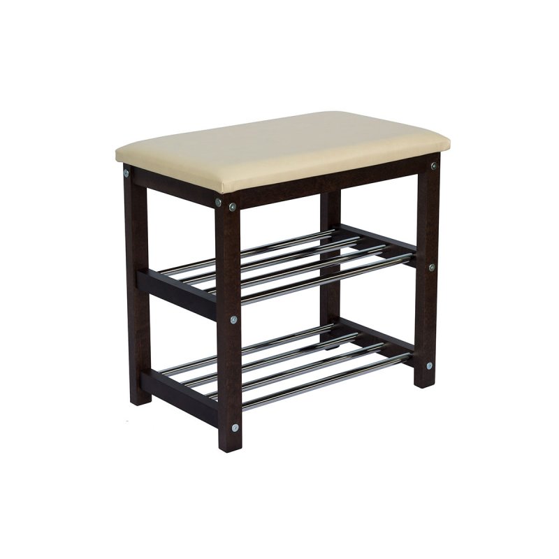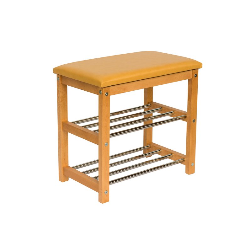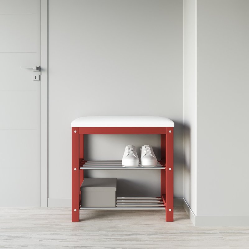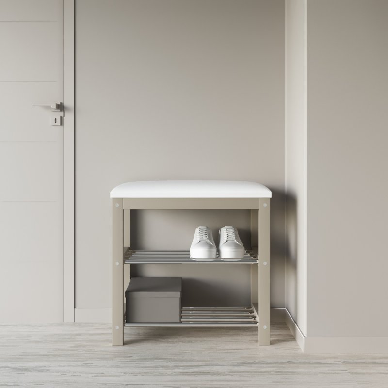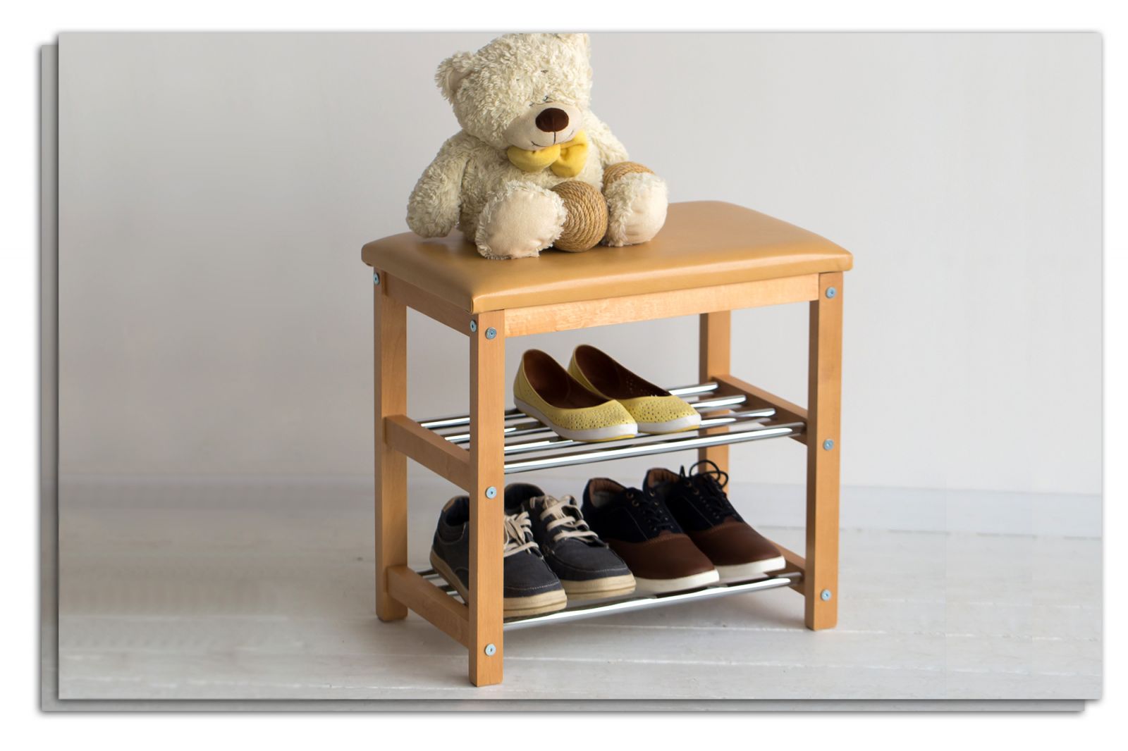 Главное, чем интересна такая банкетка для обуви с полкой – компактность. Благодаря негабаритным размерам, запросто вписывается в малые проемы, ниши и идеально – в небольшую прихожую. Две открытые полки вмещают до 6 пар сапог и туфель.
