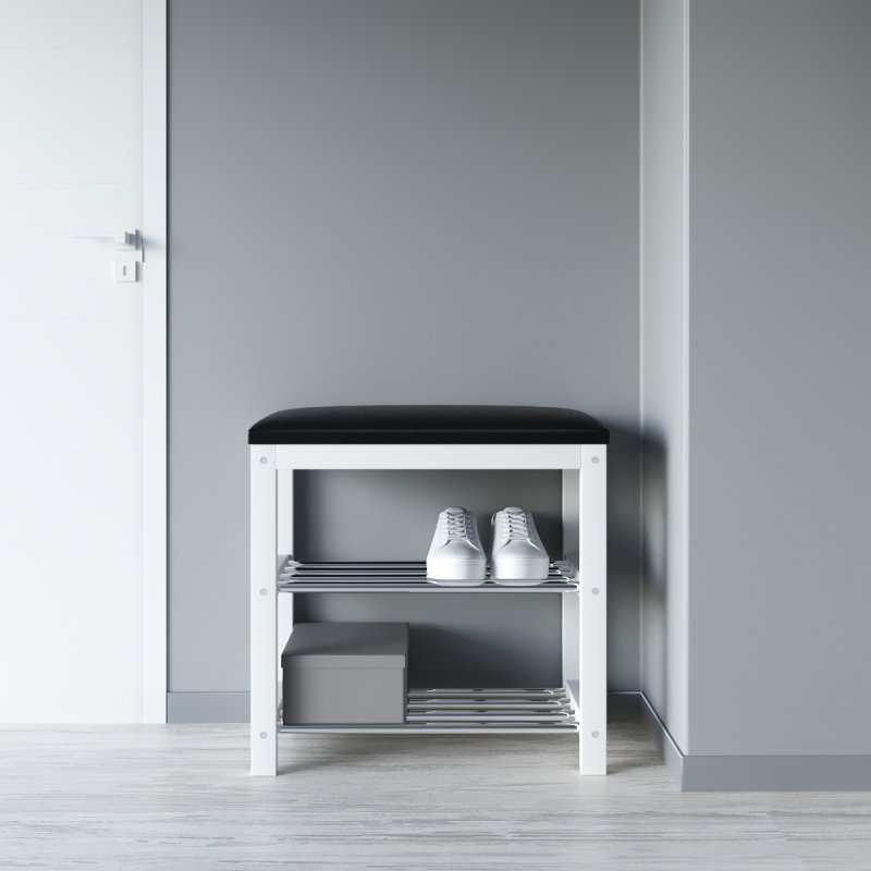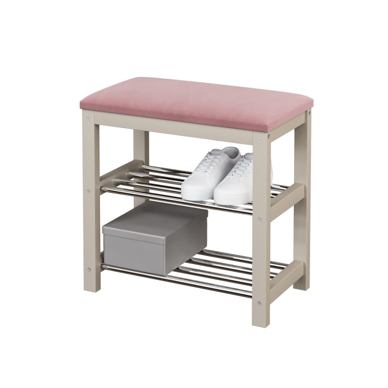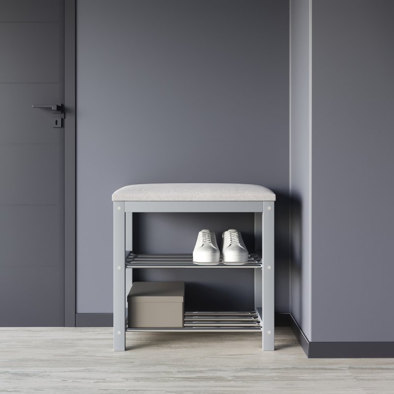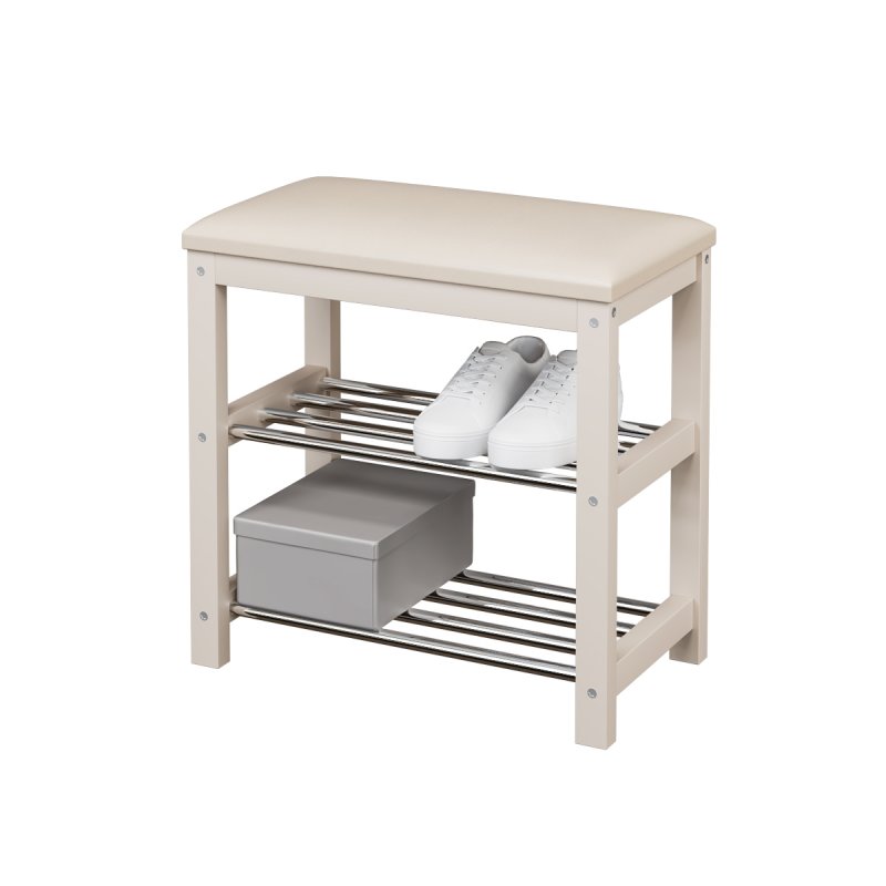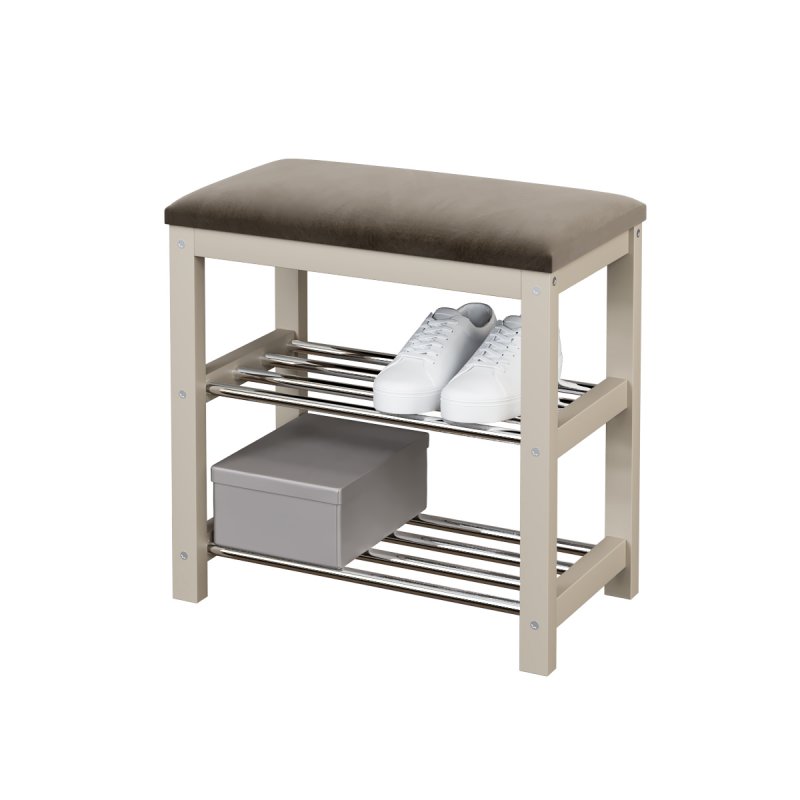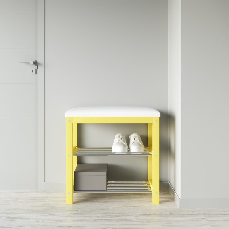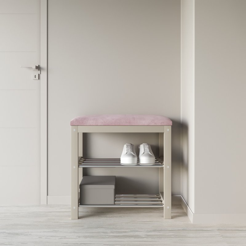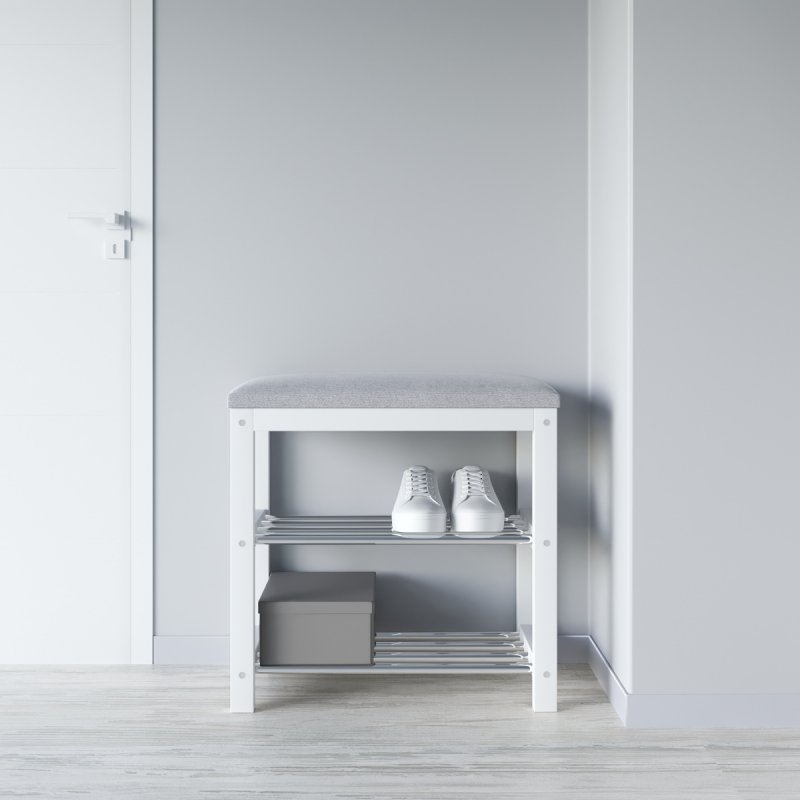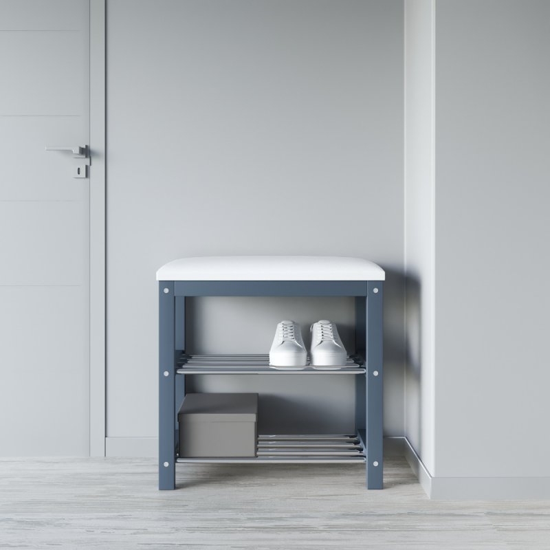 Главное, чем интересна такая банкетка для обуви с полкой – компактность. Благодаря негабаритным размерам, запросто вписывается в малые проемы, ниши и идеально – в небольшую прихожую. Две открытые полки вмещают до 6 пар сапог и туфель.