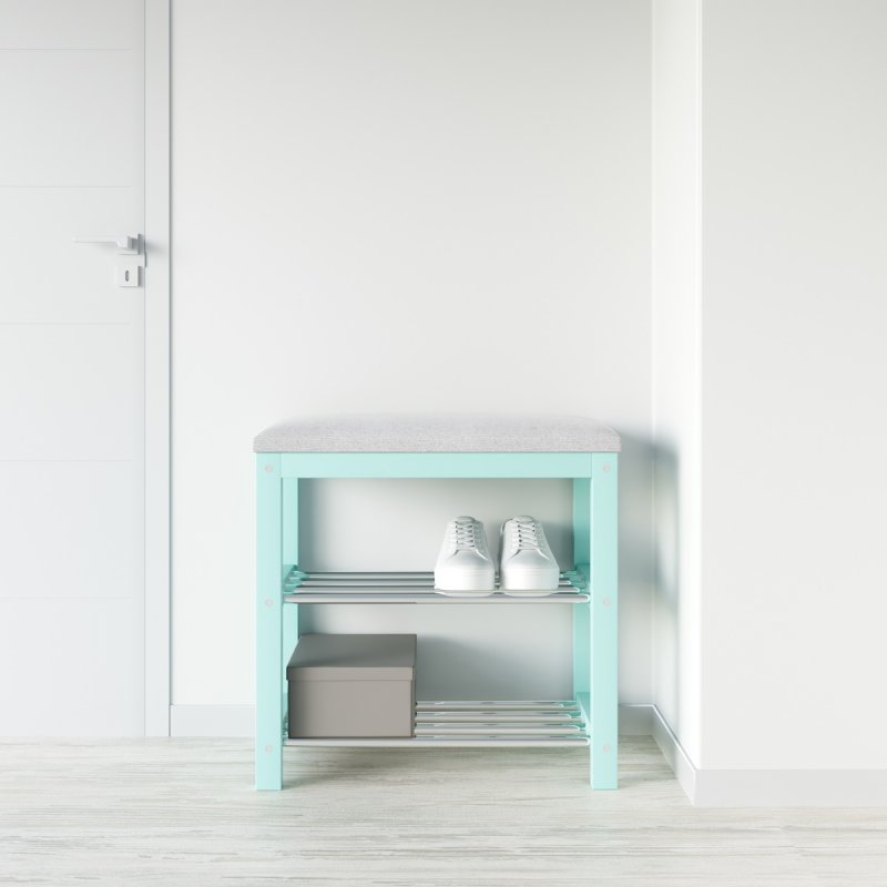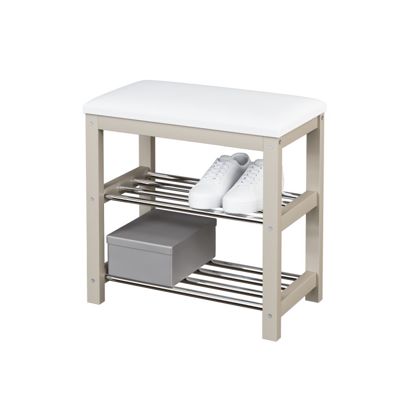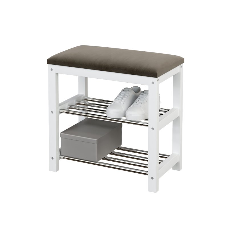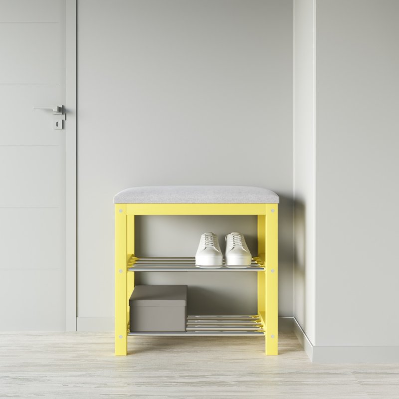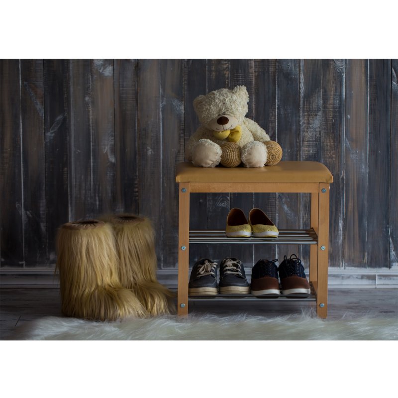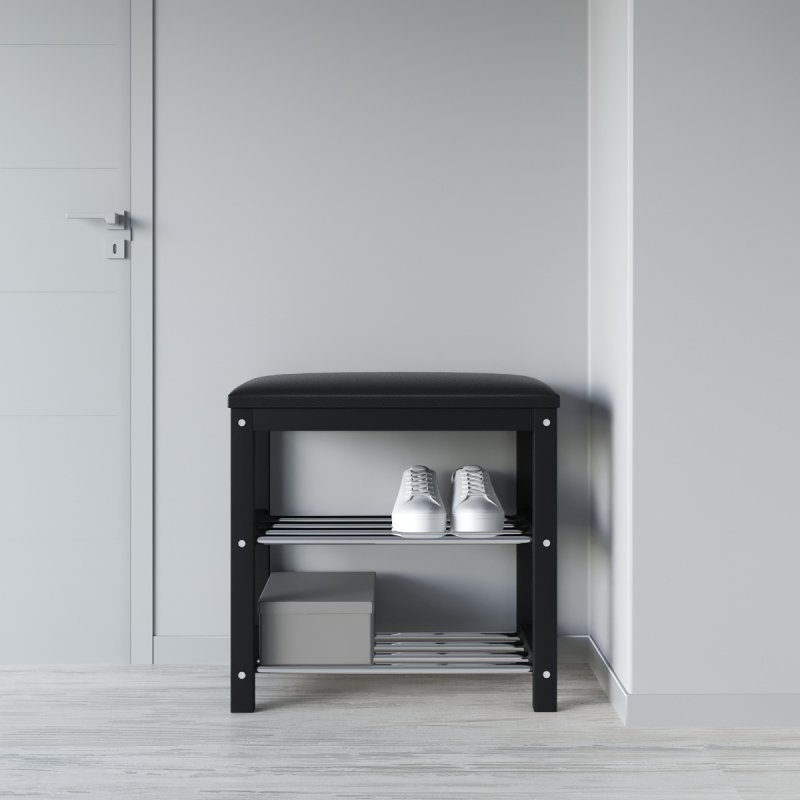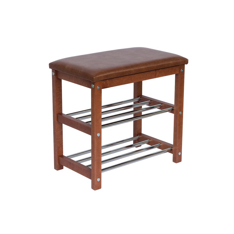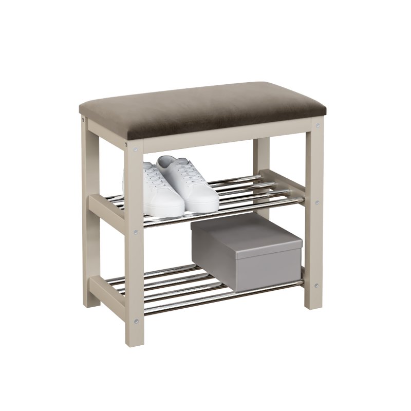 Главное, чем интересна такая банкетка для обуви с полкой – компактность. Благодаря негабаритным размерам, запросто вписывается в малые проемы, ниши и идеально – в небольшую прихожую. Две открытые полки вмещают до 6 пар сапог и туфель.