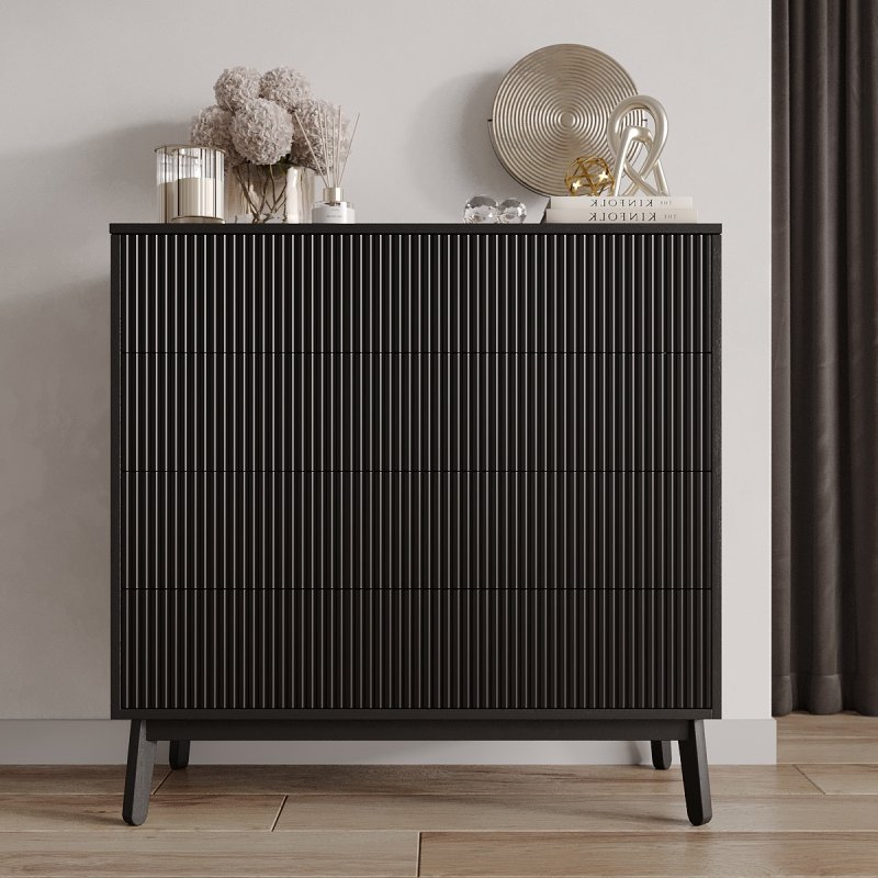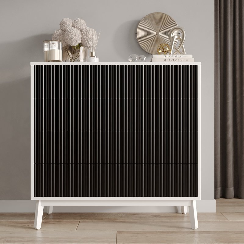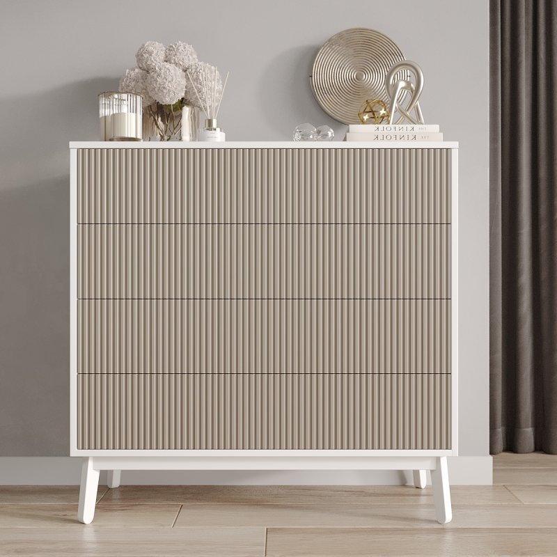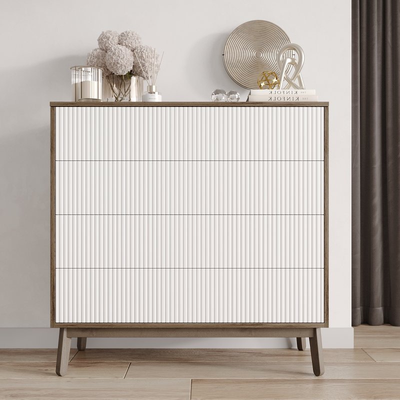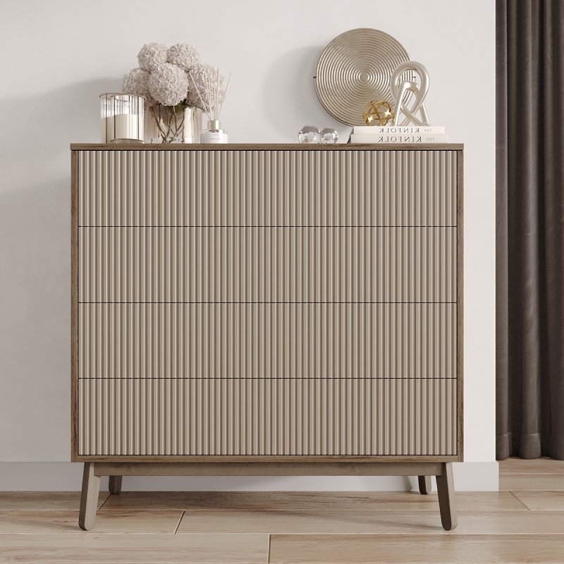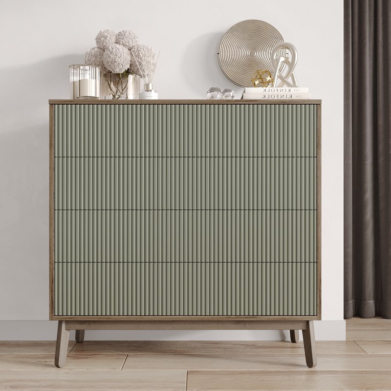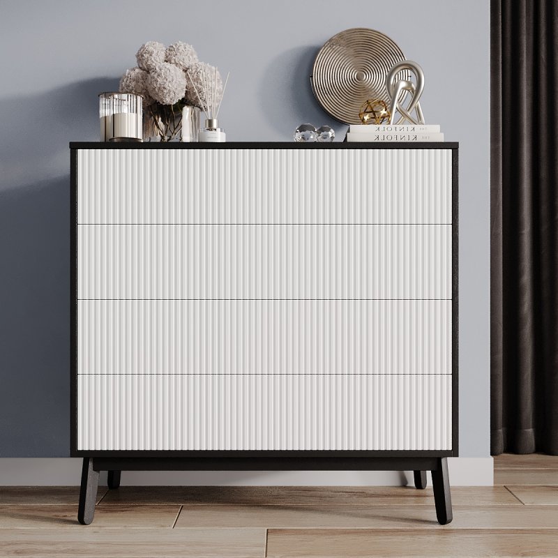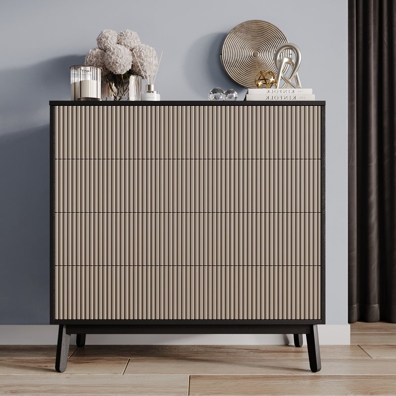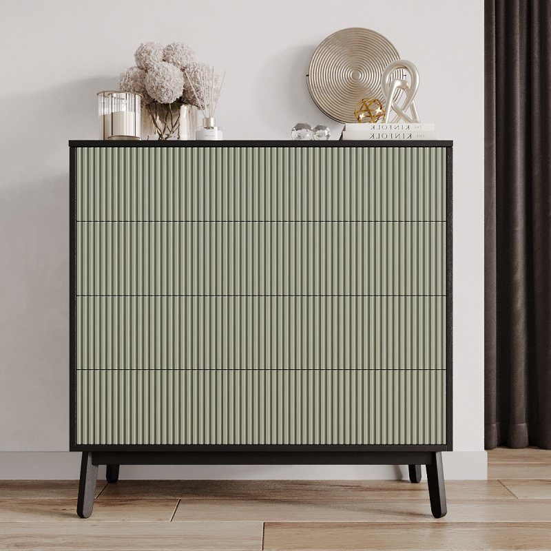Четыре выдвижных ящика и две полки внутри комода достаточно глубокие, чтобы хранить в них одежду, постельное белье, предметы туалета. Таким образом, за счет количества и разнообразной внутренней организации, Вам будет проще структурировать характерные вещи.