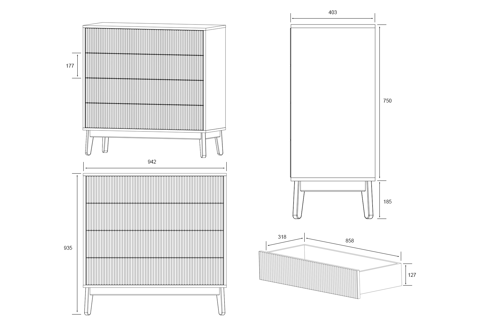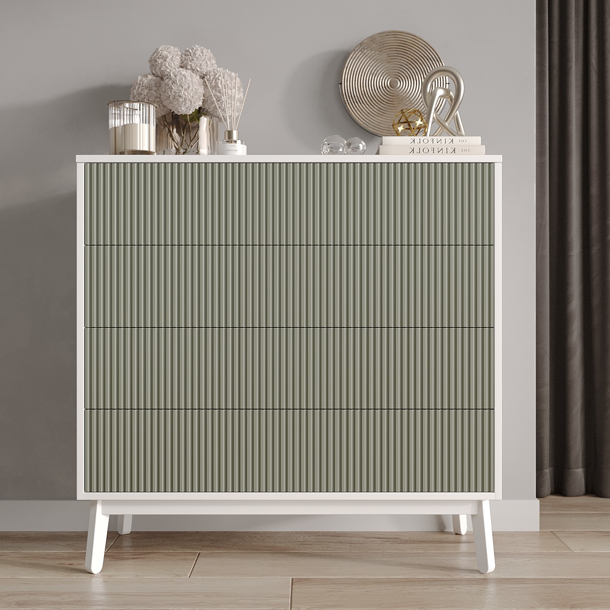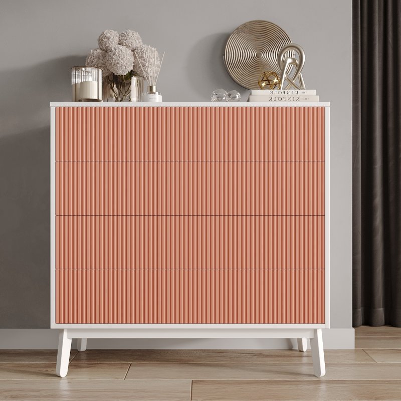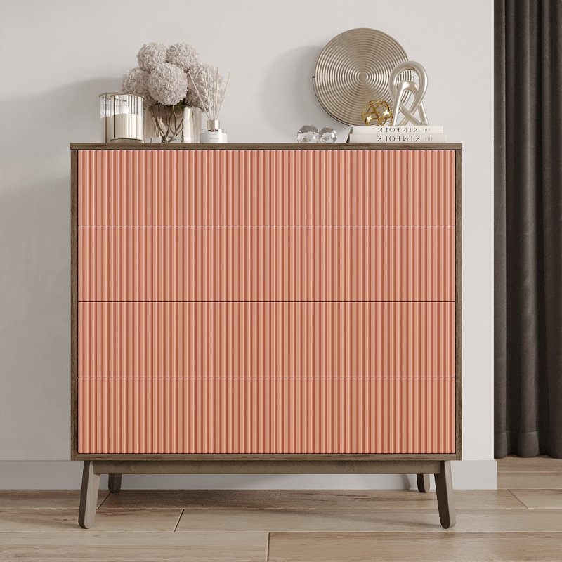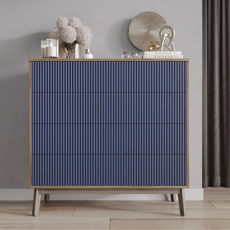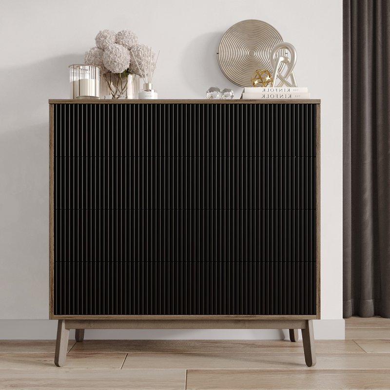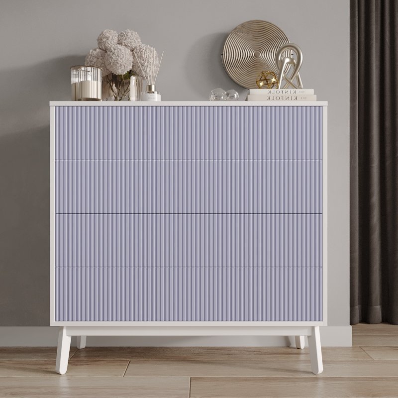 Четыре выдвижных ящика и две полки внутри комода достаточно глубокие, чтобы хранить в них одежду, постельное белье, предметы туалета. Таким образом, за счет количества и разнообразной внутренней организации, Вам будет проще структурировать характерные вещи.