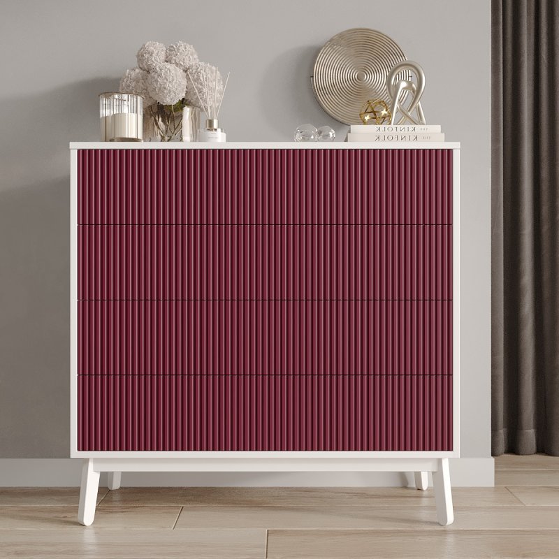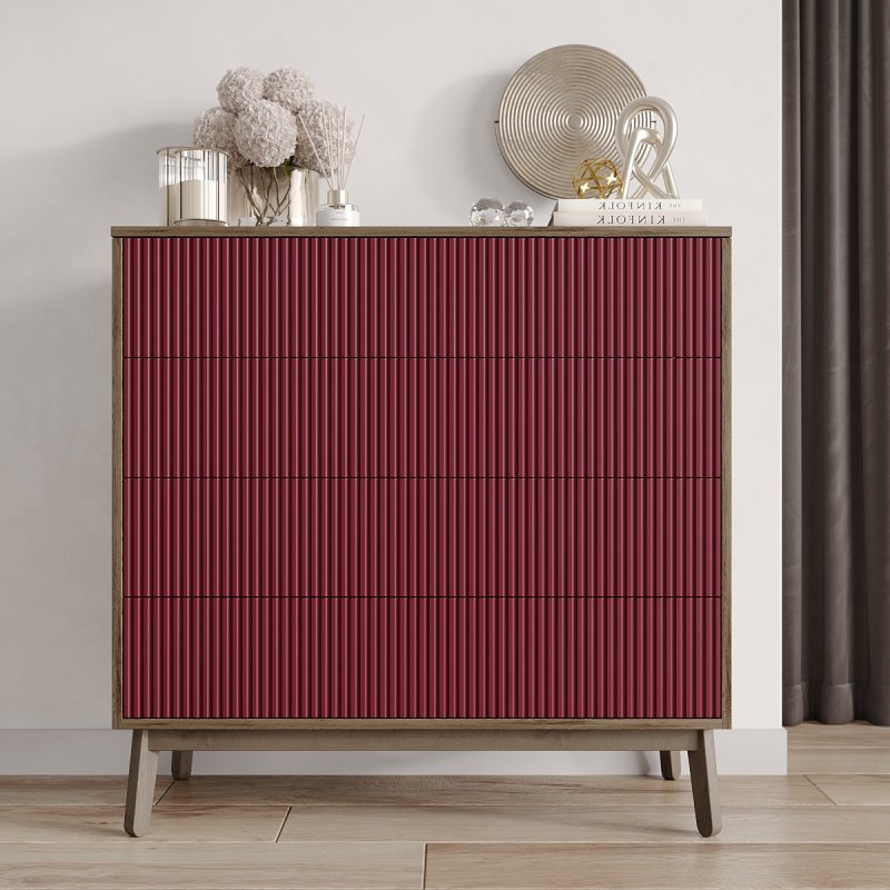 Изделие выполнено из ЛДСП, МДФ и натурального массива березы в отдельных частях. Крашеные фасады с гофрированной структурой в множественной вариации цвета, основа же существует в трех вариантах - черный, белый или аликанте, эти цвета имеют десять красочных комбинаций. Вам осталось лишь выбрать дуэт из двух цветов, гармонично и сбалансировано подобранных дизайнером. В комоде использована система открытия фасадов от нажатия, с помощью специальной фурнитуры пуш ап или как еще ее называют - тип-он.