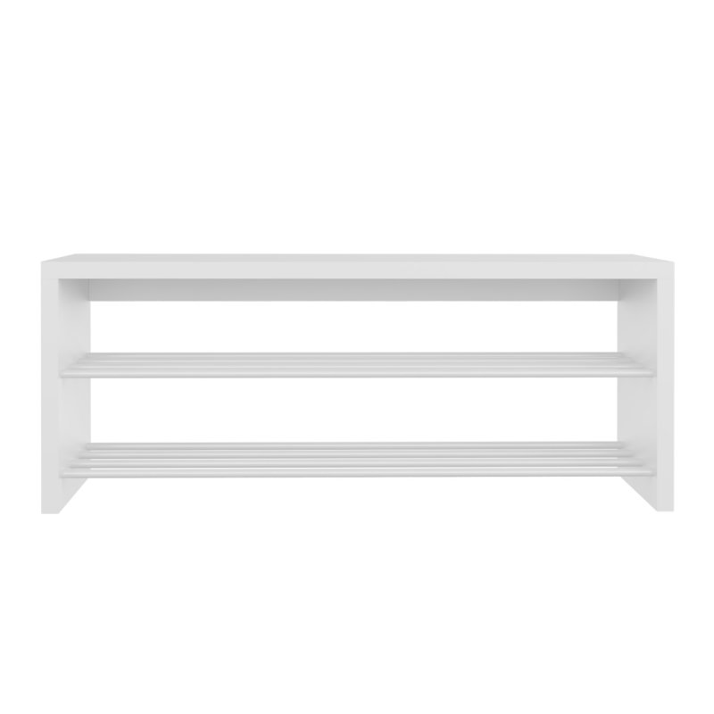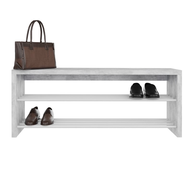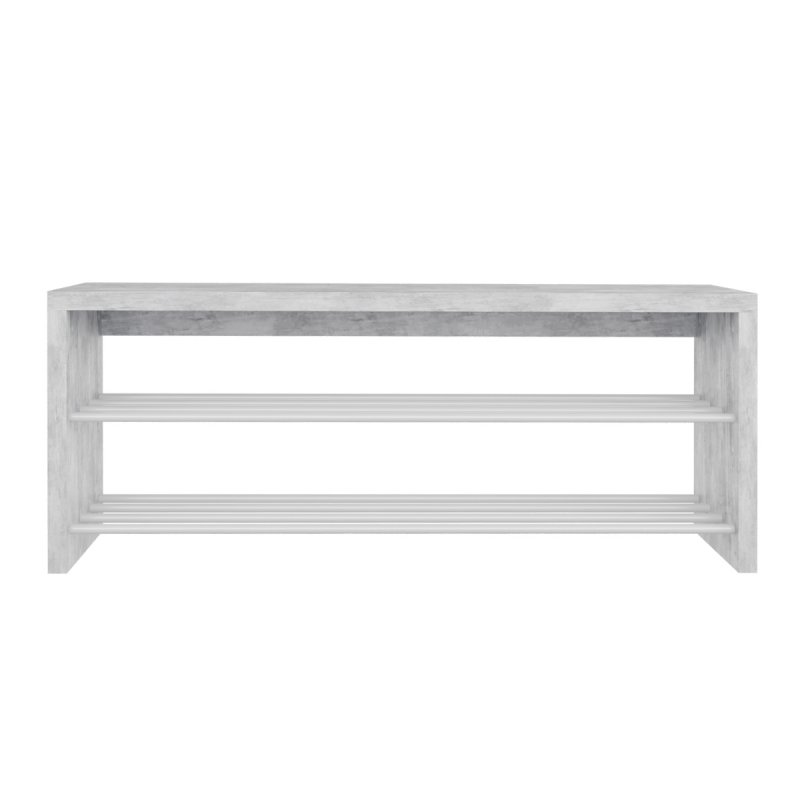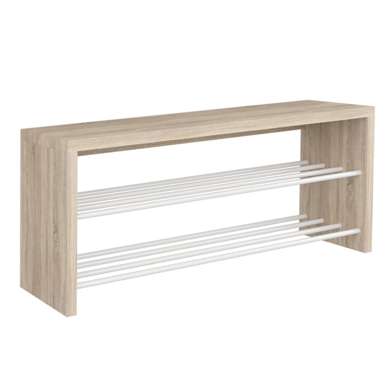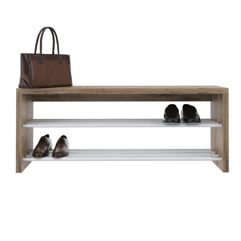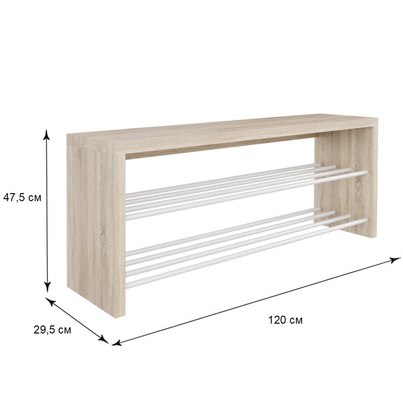 Полка для обуви образована из нескольких металлических трубок, которые покрыты специальной защитной краской. Это позволяет размещать грязную уличную обувь, не боясь испортить поставку. Габаритные размеры изделия составляют (В/Ш/Г): 475×1200×295 мм.