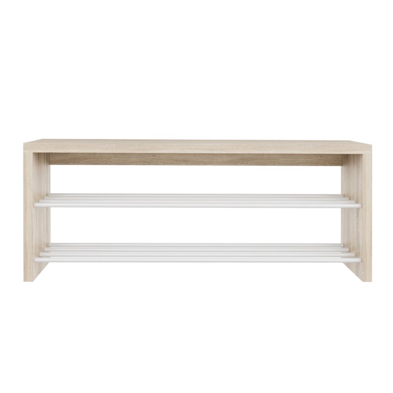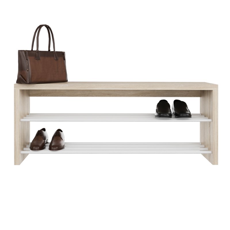 Банкетка с полками для обуви выполнена из двойной ламинированной ДСП (толщина – 32 мм), это обеспечивает повышенную прочность и долговечность изделия в целом. Модель не требует особого ухода, достаточно изредка проводить влажную уборку.