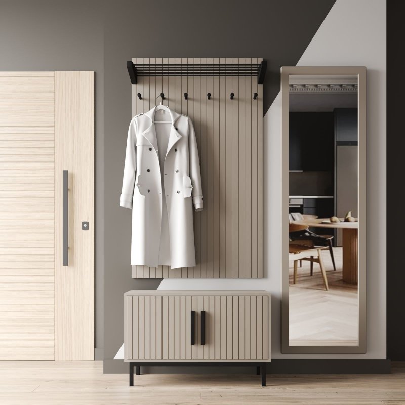Настенная вешалка (1300х770х270мм) оснащена шестью крючками для верхней одежды ежедневного использования и нишей для аксессуаров и головных уборов. Тумба с полочками для обуви (500х770х370мм) имеет закрытый вид, что помогает защитить содержимое от пыли и посторонних глаз. Высота ножек рассчитана для комфортной уборки под изделием, а поверхность послужит отличной подставкой для сумок, пакетов, телефона и других мелочей. Зеркало в полный рост (1665х520х200мм) – обязательный атрибут современной прихожей, так как дает возможность оценить свой внешний вид перед выходом из дома, поправить прическу или нанести макияж.