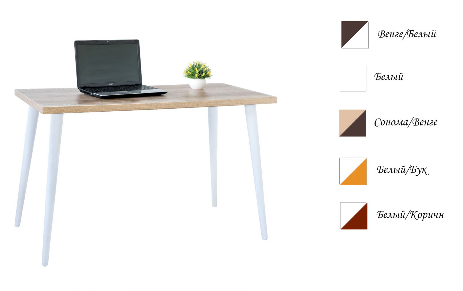 Столешница может быть представлена в нескольких вариантах цвета ДСП: белый, дуб, коричневый, ильм, венге, дуб сонома. Ножки выполнены в следующих вариантах: белый, серебро, бук, коричневый, молочный, венге. Вы можете скомбинировать индивидуальный вариант цветового сочетания, в зависимости от личных предпочтений.