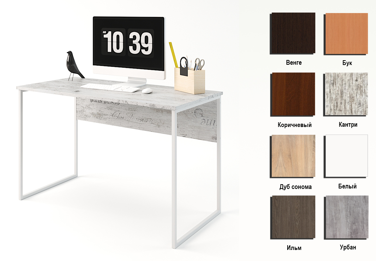 Компьютерный стол выпускается в двух размерах (В/Ш/Г): 740×1000×600 (размер А), 740×1200×600 (размер В), 740×1000×700 (размер С) и 740×1200×700 (размер D) и нескольких вариантах цвета ДСП: венге, коричневый, бук, кантри, дуб сонома, ильм, урбан и белый.