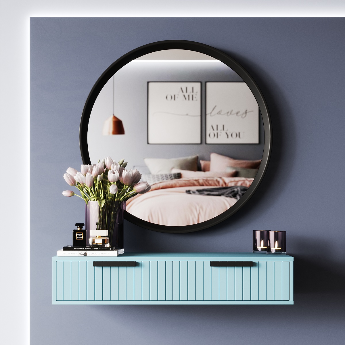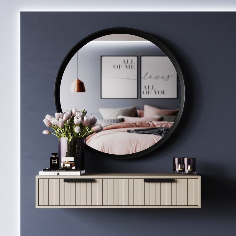Отличается трюмо от других разновидностей туалетных столиков наличием одного большого зеркала над столешницей. Помимо своих основных функций, зеркало также играет большую дизайнерскую роль. Оно может визуально увеличивать комнату, придавать ей света и яркости. Для комфортного нанесения макияжа, размещать столик необходимо недалеко от окна.