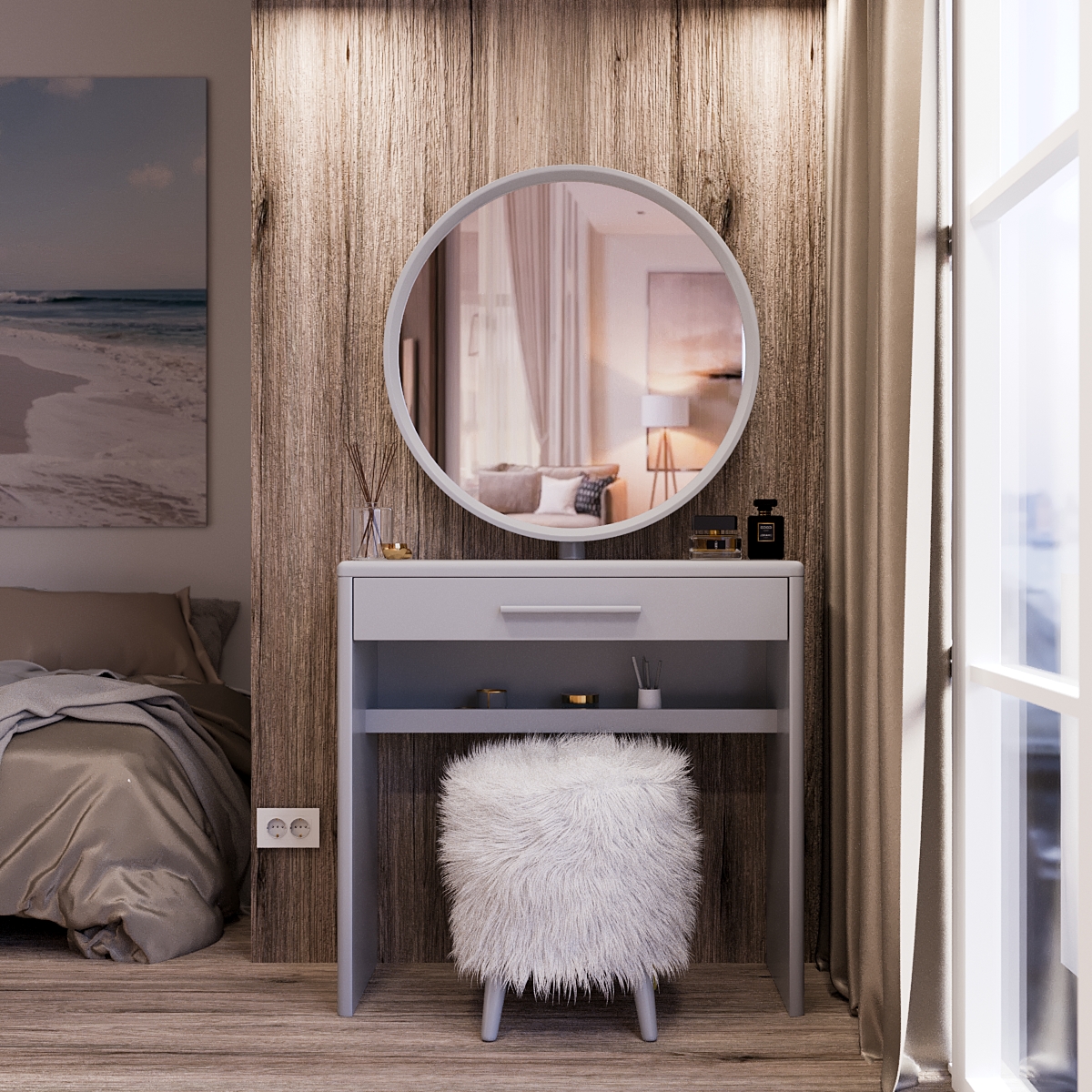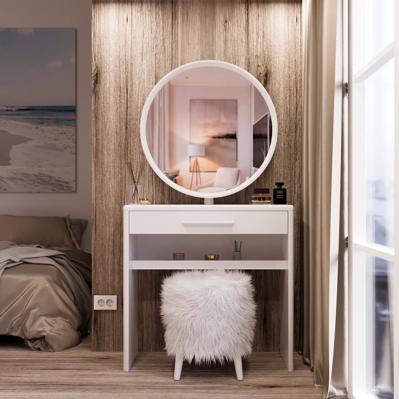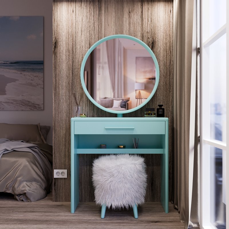 Трюмо с пуфиком “Исландия” имеет сразу несколько преимуществ и помогает исключить подобные проблемы из нашей жизни. У вас появляется идеальное пространство для хранения косметических средств, место для нанесения макияжа, большое зеркало с возможностью поворачивать его и, конечно же, удобное место для сидения.
