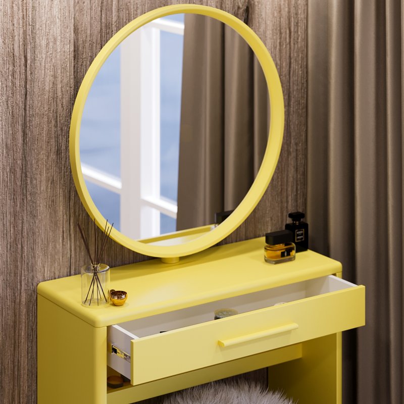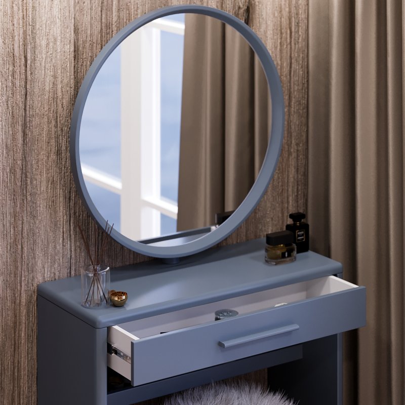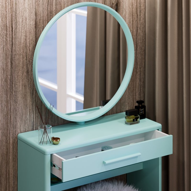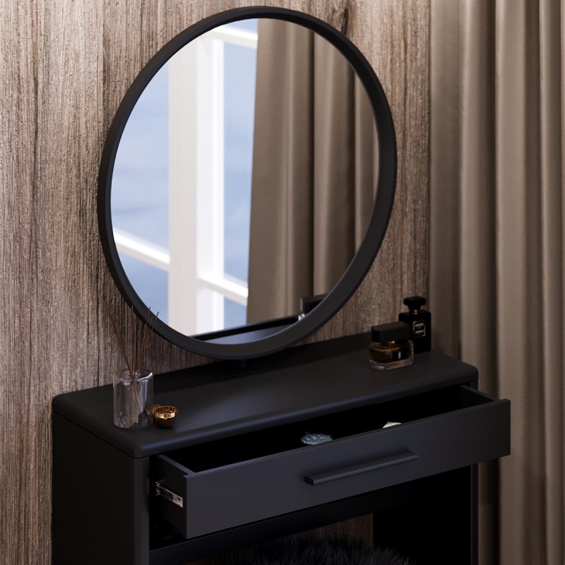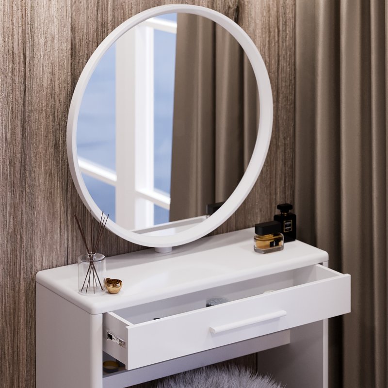 Круглое зеркало зафиксировано в столешнице, его классическая форма всегда выигрышно смотрится в любом интерьере. Модель выполнена из МДФ, диаметр зеркала составляет 60 см. Габаритные размеры столика с зеркалом составляют (В/Ш/Г): 1410×735×340 мм.