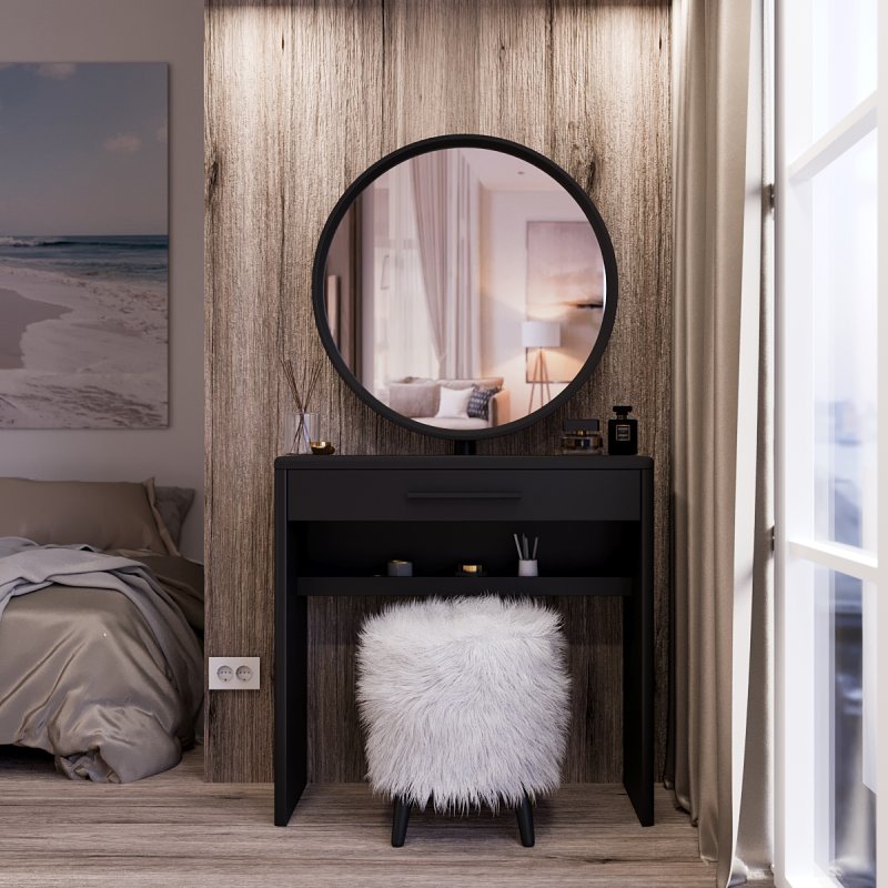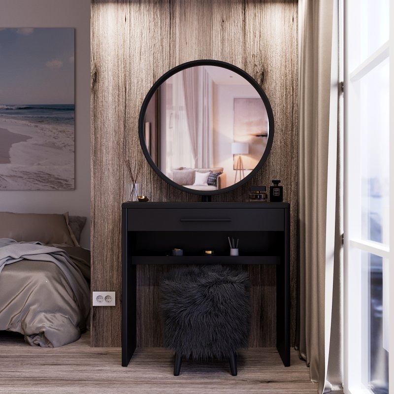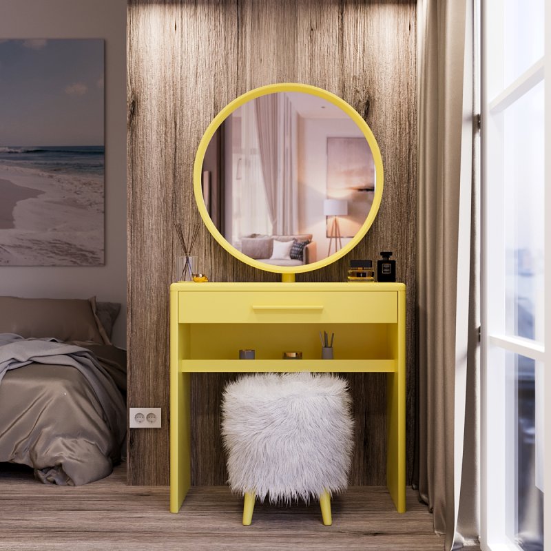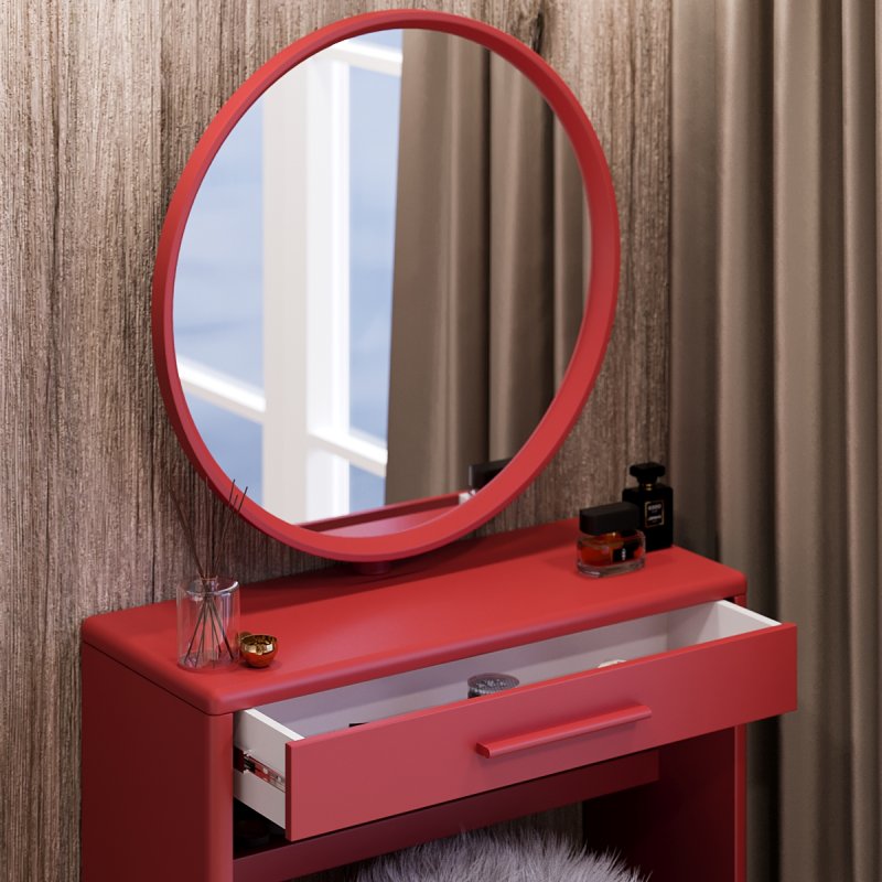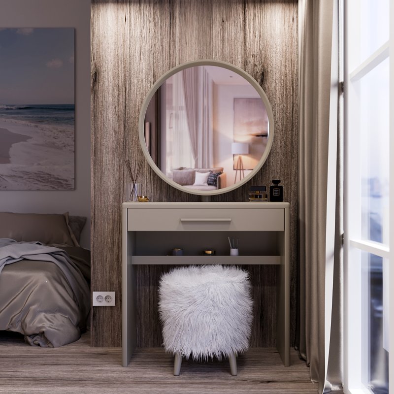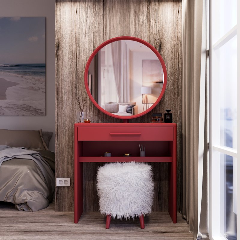 Туалетный столик “Аскольд” изготовлен из МДФ и представлен в нескольких цветовых вариациях. Трюмо имеет достаточно широкую столешницу, глубокий выдвижной ящик и дополнительную полку под ним.