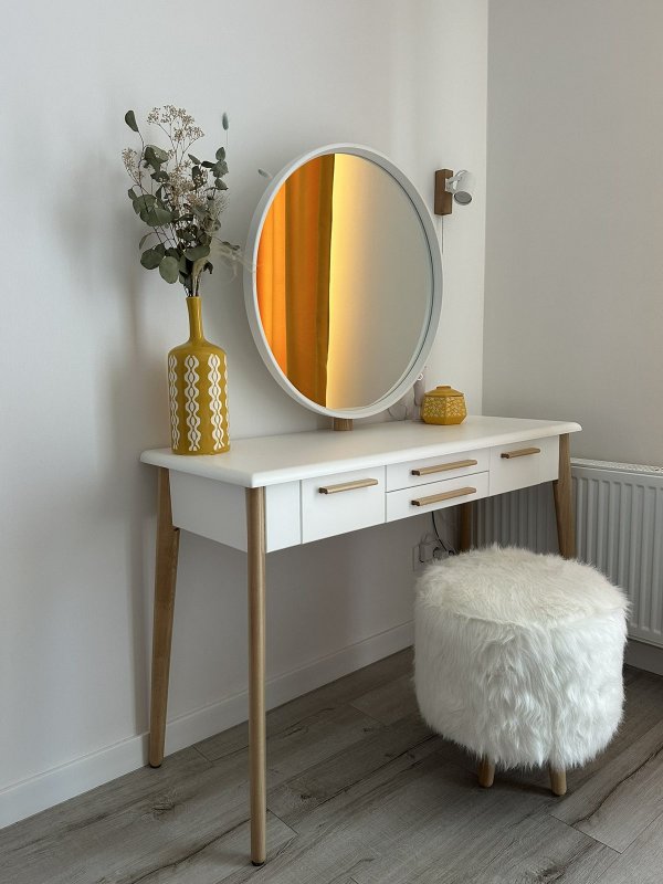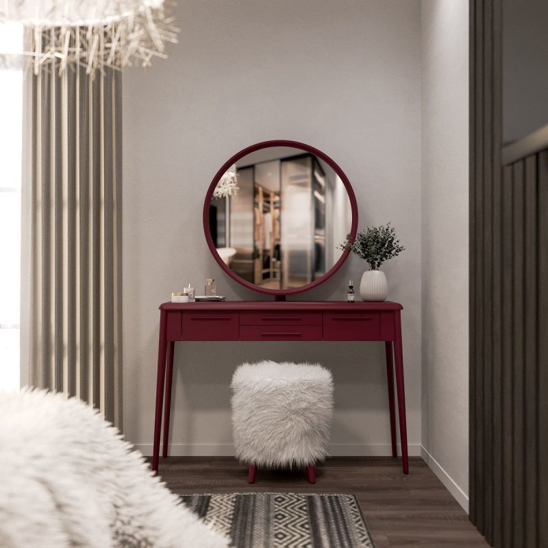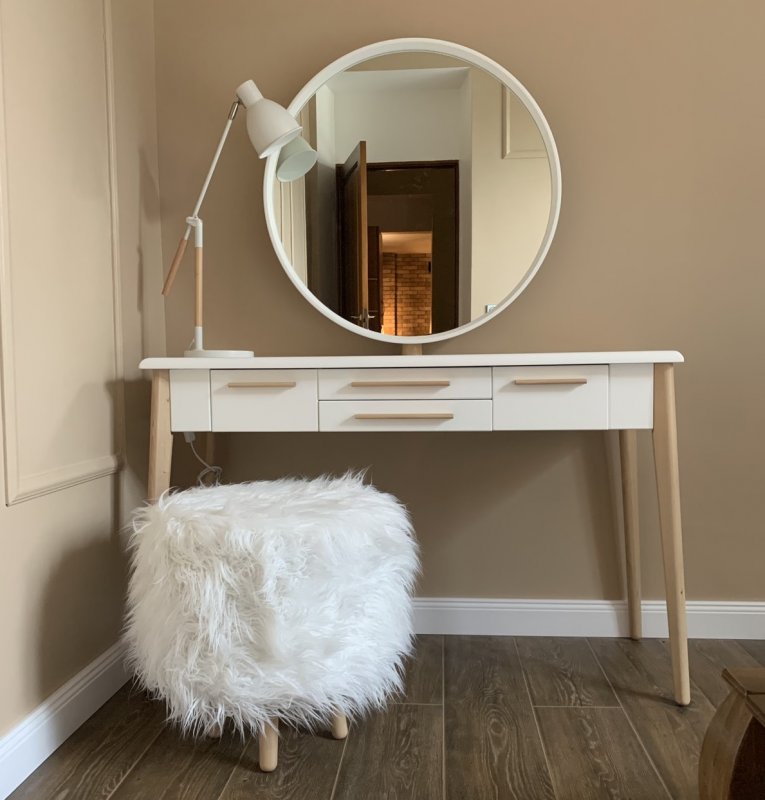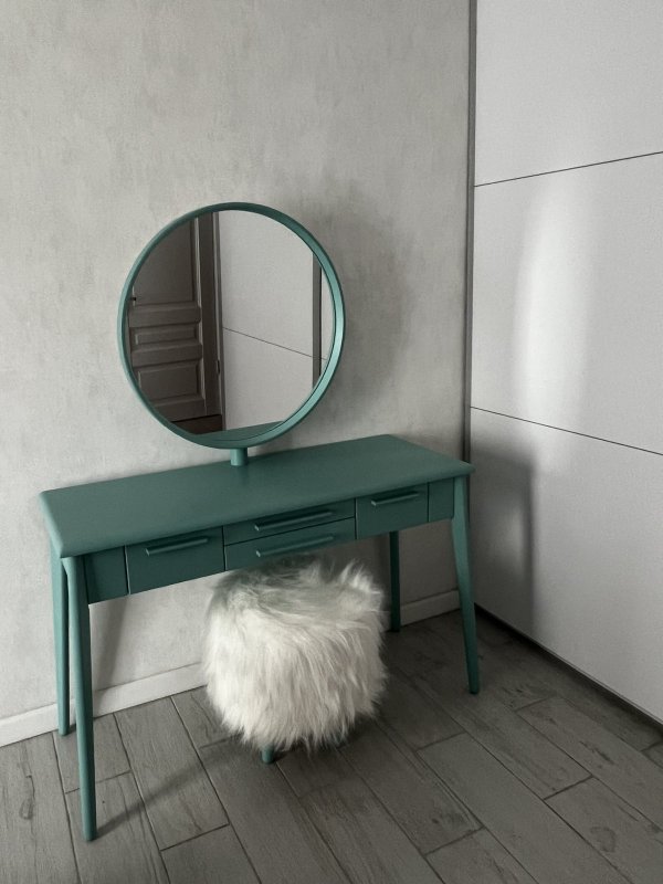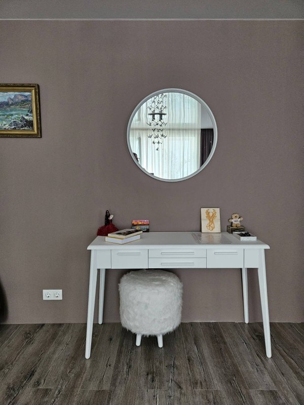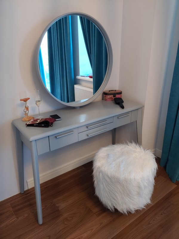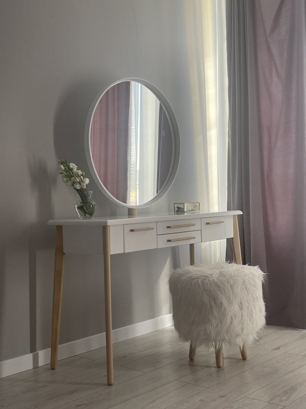 Конструкция ножек стола исключает дискомфорт для ног во время сидения, так как они расширены к низу. Наличие четырёх выдвижных ящиков (более глубоких по бокам и двух широких по центру) помогут организовать место для хранения различных мелочей от помад до серёжек и сохранить порядок. Основная часть трюмо и основа зеркала выполнены из МДФ. Отдельные детали (ручки ящиков и ножки стола) - из натурального массива берёзы.