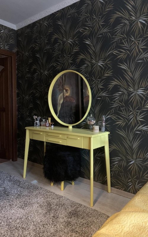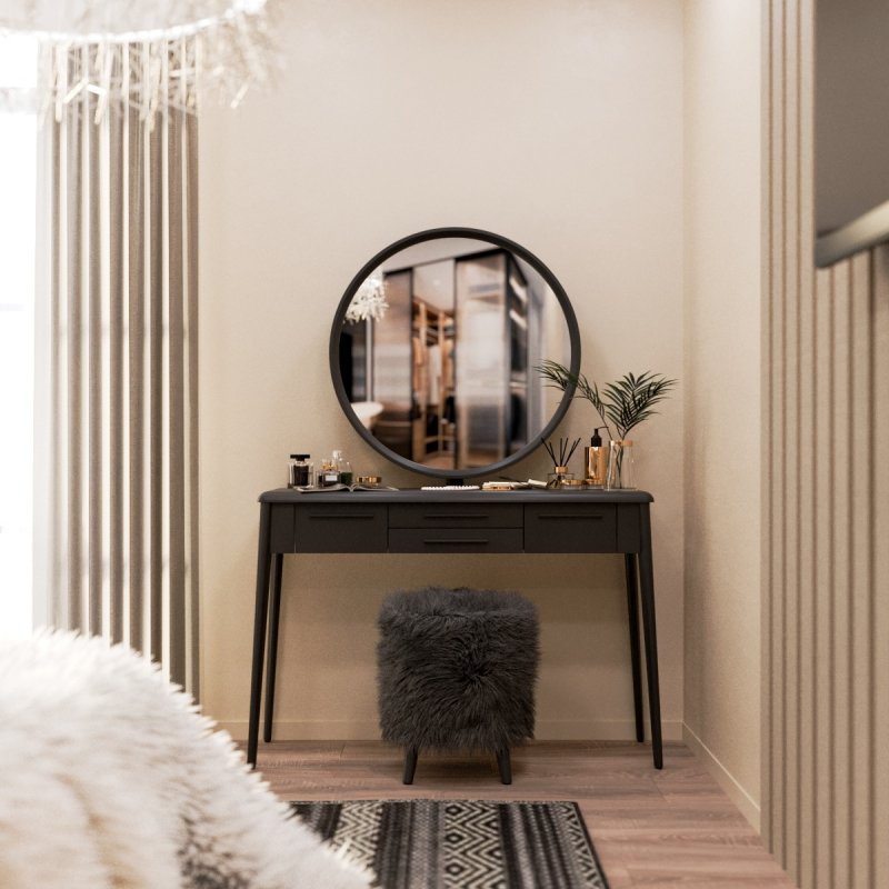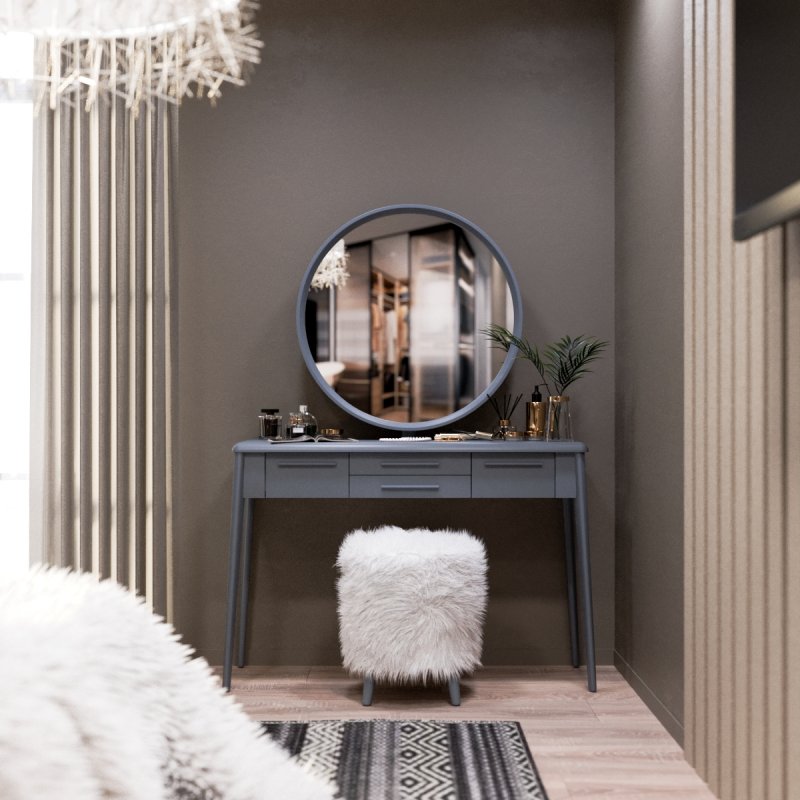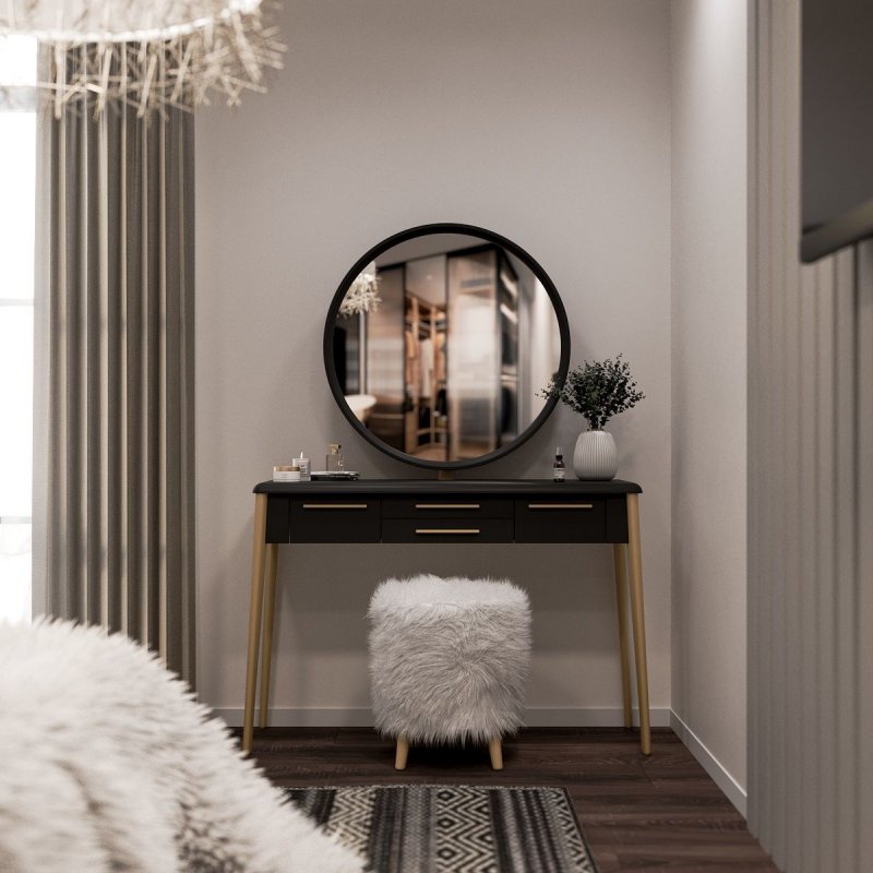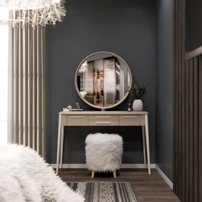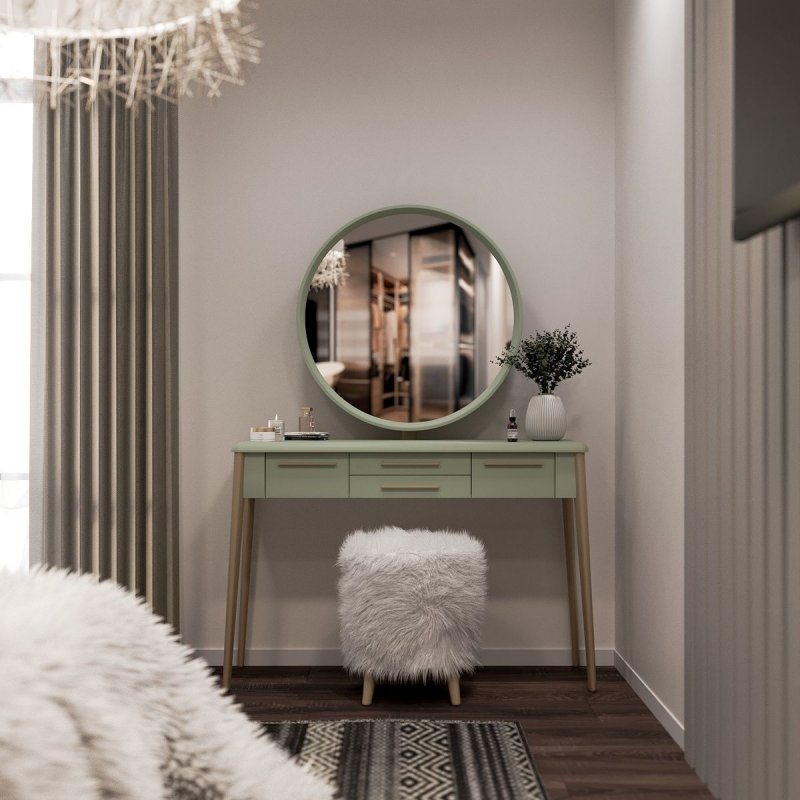 Конструкция ножек стола исключает дискомфорт для ног во время сидения, так как они расширены к низу. Наличие четырёх выдвижных ящиков (более глубоких по бокам и двух широких по центру) помогут организовать место для хранения различных мелочей от помад до серёжек и сохранить порядок. Основная часть трюмо и основа зеркала выполнены из МДФ. Отдельные детали (ручки ящиков и ножки стола) - из натурального массива берёзы.