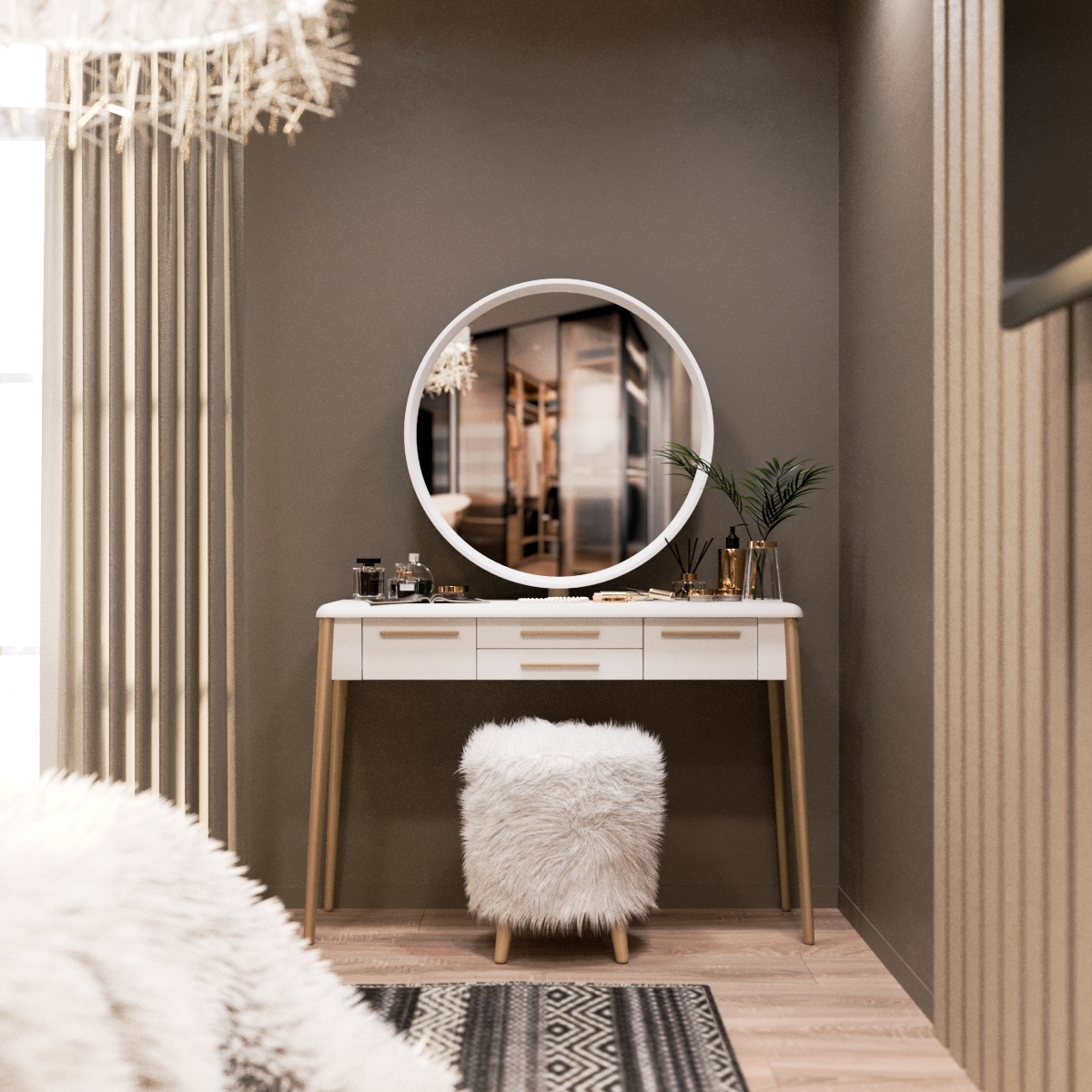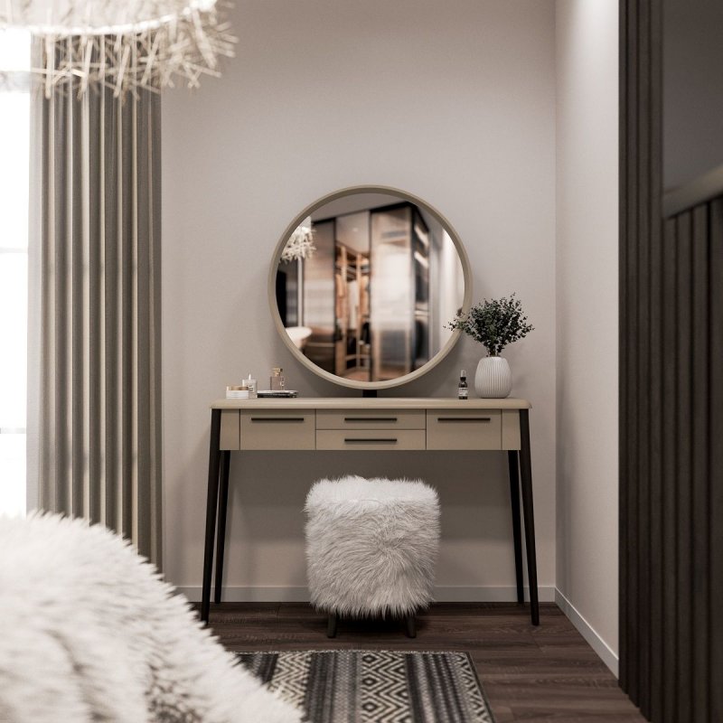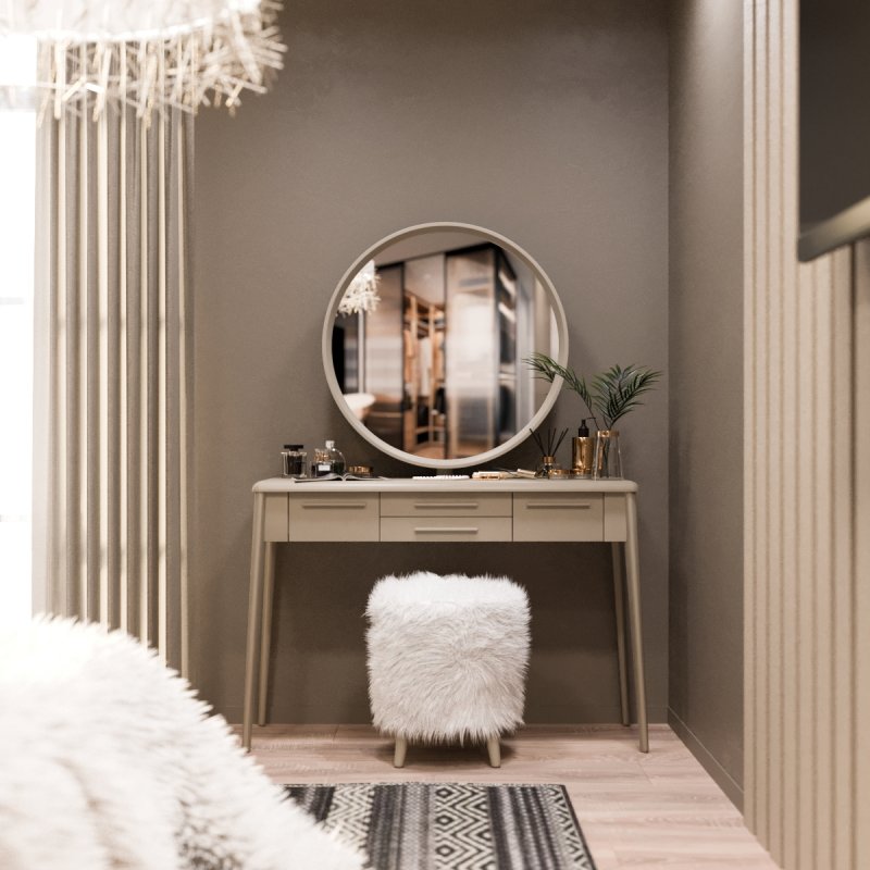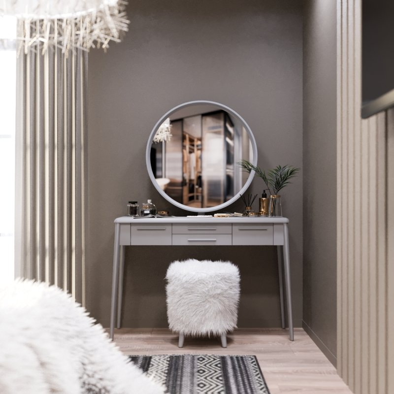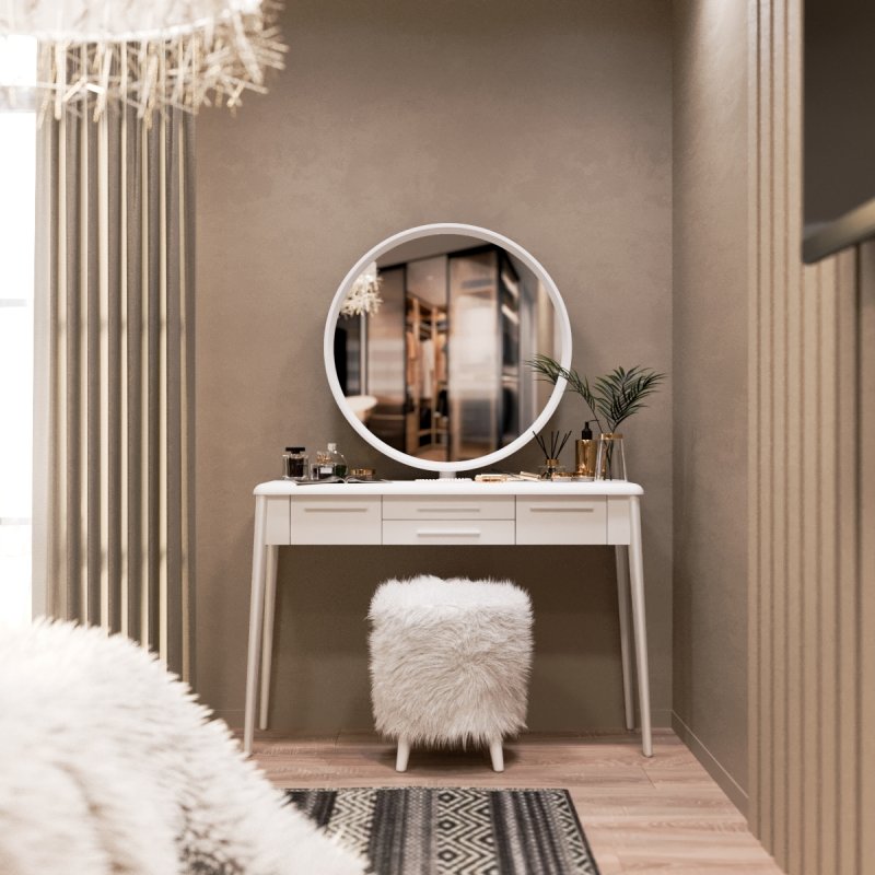 Пушистый пуф “Осман” - изюминка набора, он может служить не только местом для сидения, но и подставкой для ног. Его воздушная текстура, будучи тактильно очень приятной, так и напрашивается на взаимодействие с ней. Ножки выполнены из натурального массива березы, как и в трюмо, поэтому тон покраски абсолютно идентичен.