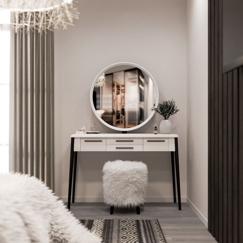 Несомненно, такого рода гарнитур будет украшением любого дома, но давайте акцентируем внимание на его полезных характеристиках. Трюмо “Бланко” - это столик для макияжа, удобное место для сидения, места для хранения личных вещей и зеркало, поворачивающееся под разными углами для комфортного нанесения косметики, в зависимости от света в комнате.