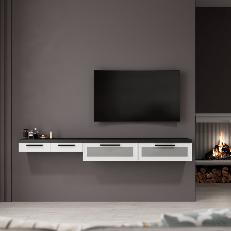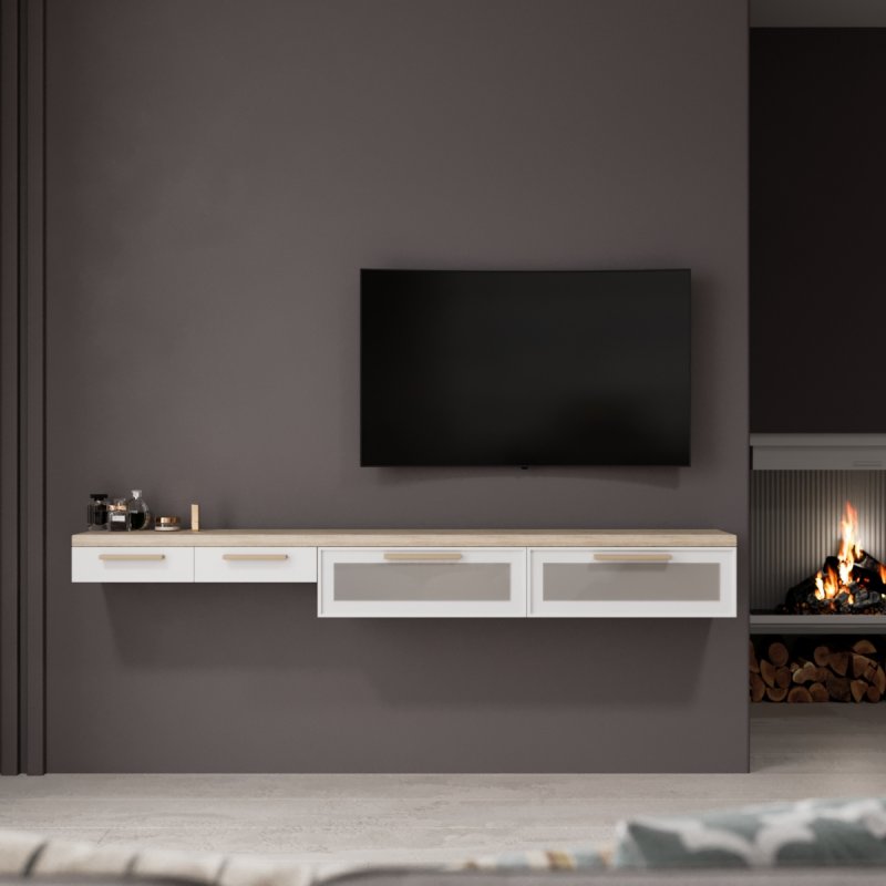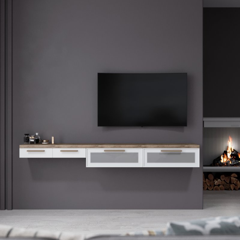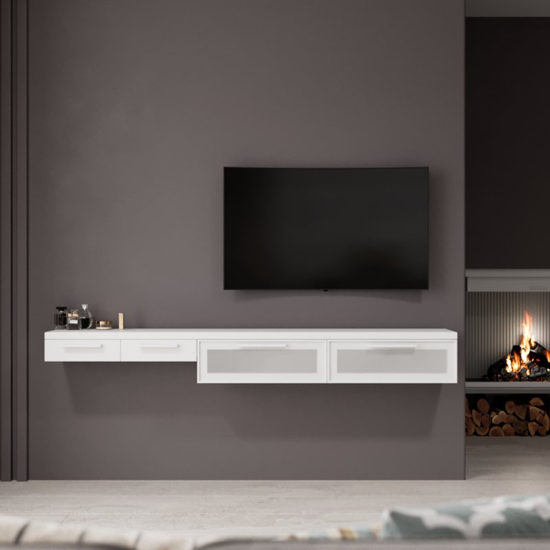 Стоит отметить, что подвесная мебель популярна не только благодаря своему современному виду, она ценится за возможность экономии места, ведь здесь нет массивных ножек или плотной конструкции, держащей основу. Она не препятствуют уборке, её не нужно перемещать, чтобы вымыть пол, она не создаст дискомфорта для пылесоса. Благодаря своему интересному строению ступенькой, вы также с лёгкостью сможете организовать удобное место для сидения, например, благодаря пуфу, а при необходимости - задвинуть его под консоль, как в комплекте "Дания 2".