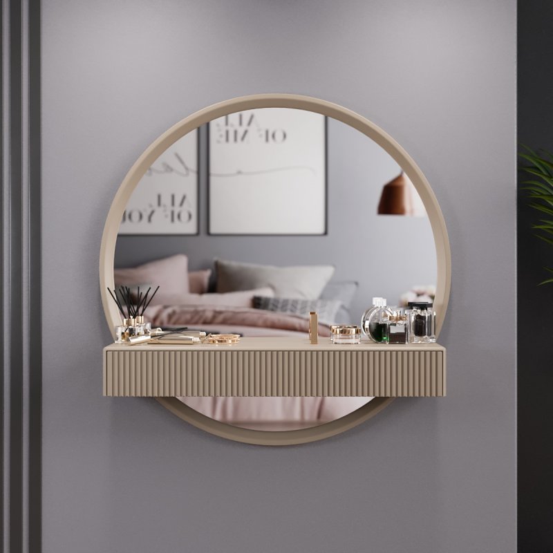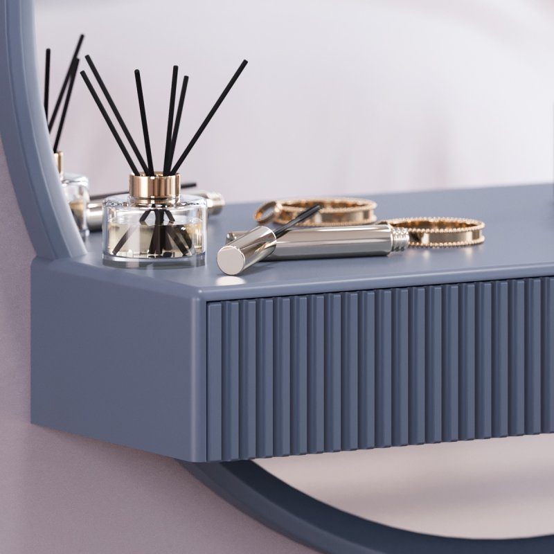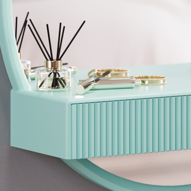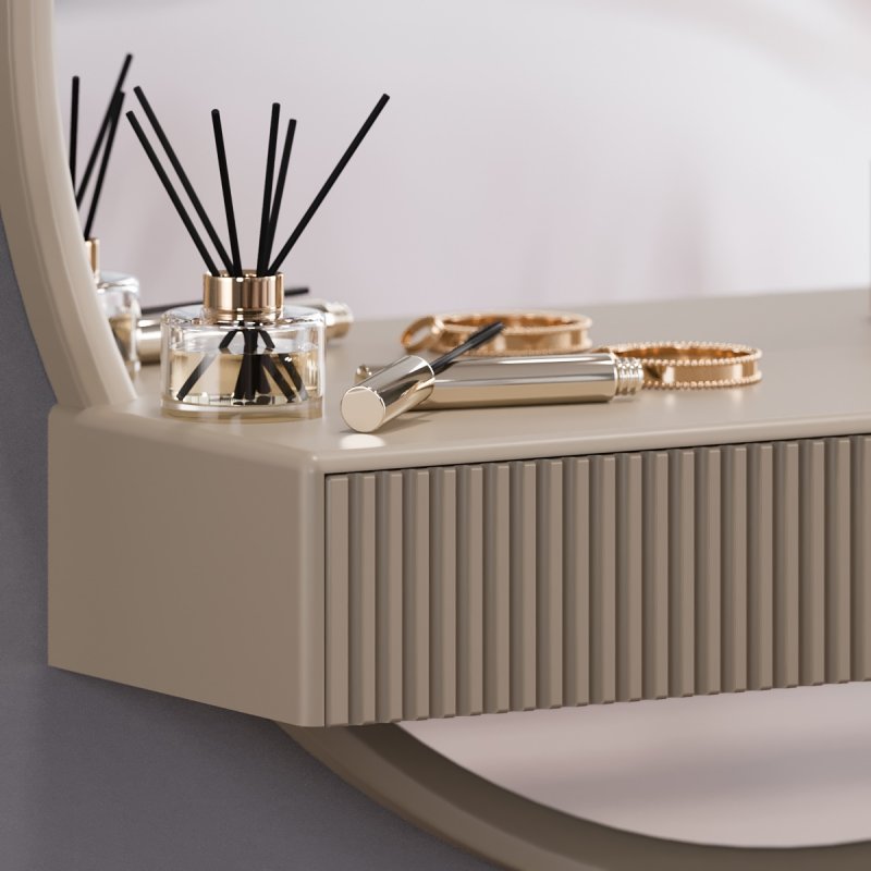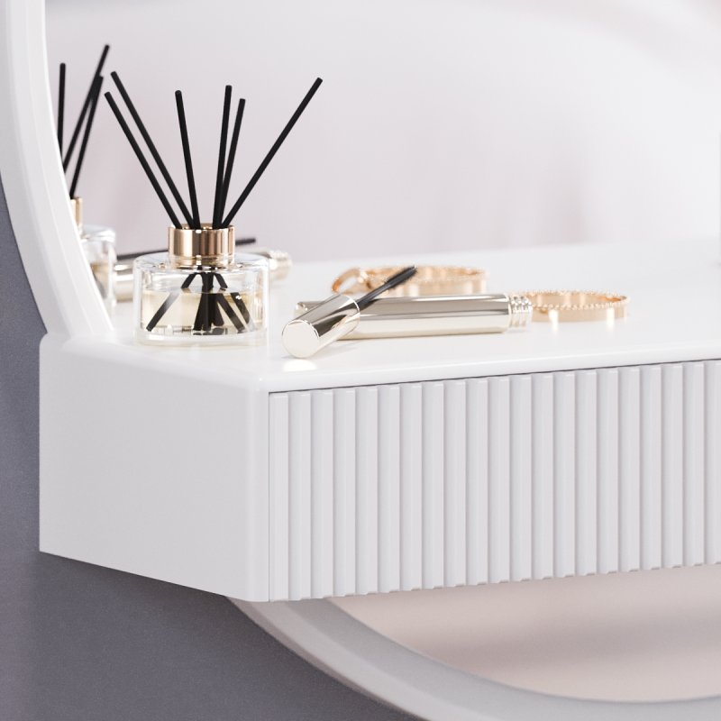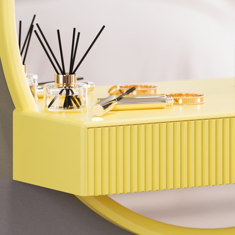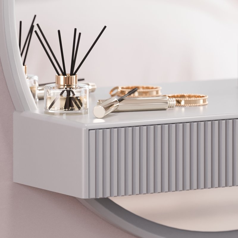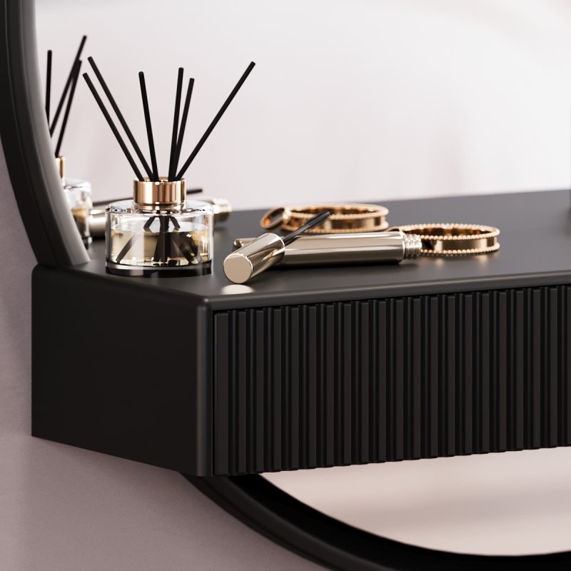 Основа изделия выполнена из крашенного МДФ, тон которого будет легко подобрать под ваш интерьер и цветовую гамму, благодаря восьми вариантам расцветки. Мы включили как “нюдовые” так и красочные тона, в том числе классический белый и строгий черный. Ширина столика пропорциональна диаметру зеркала и позволяет разместить на нём массу вещей и элементов декора.