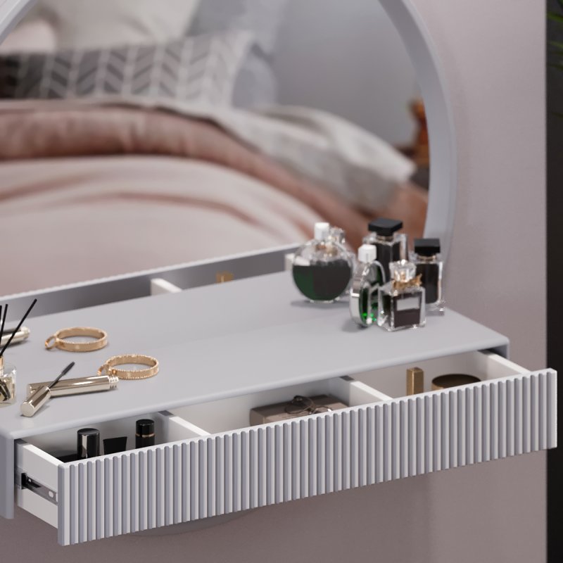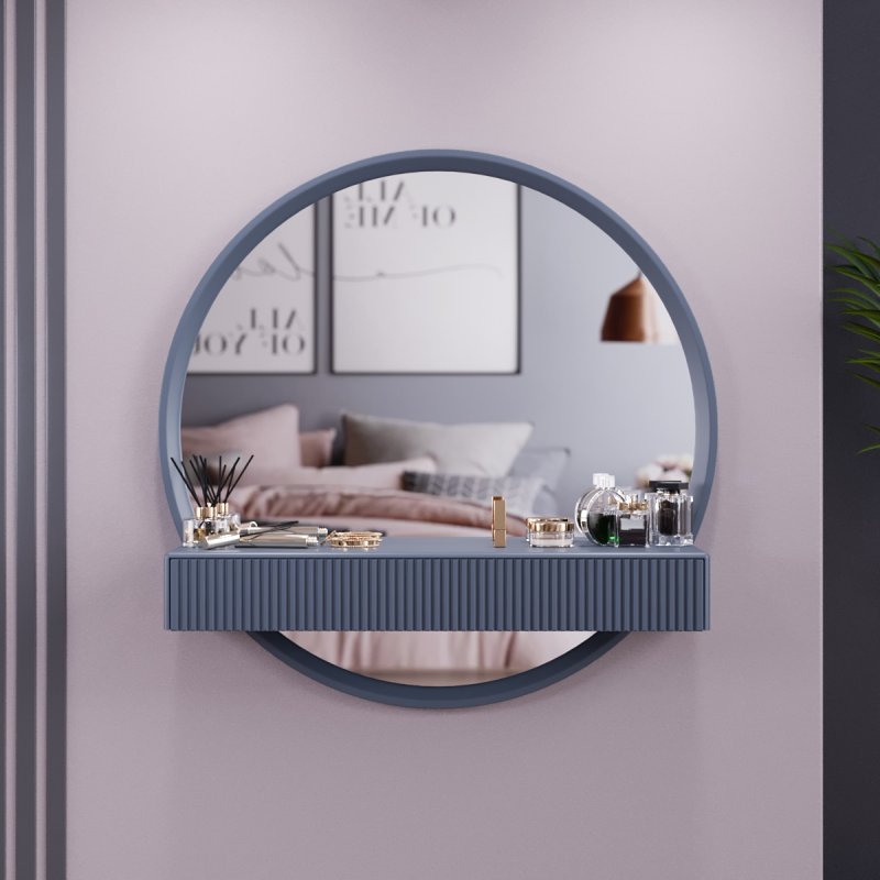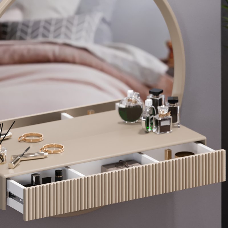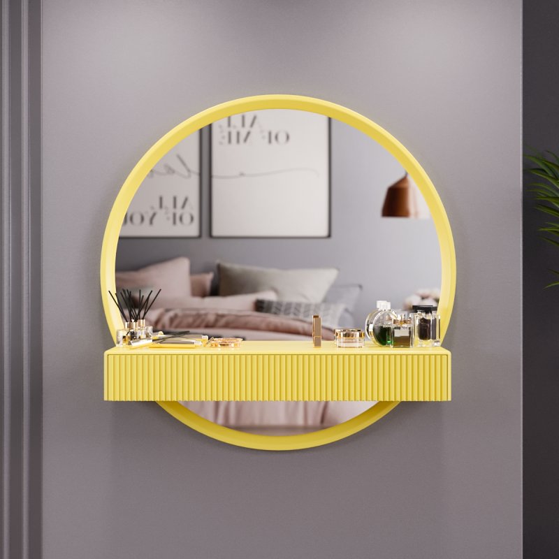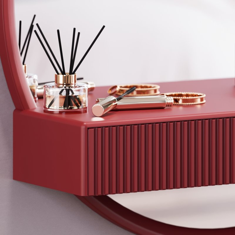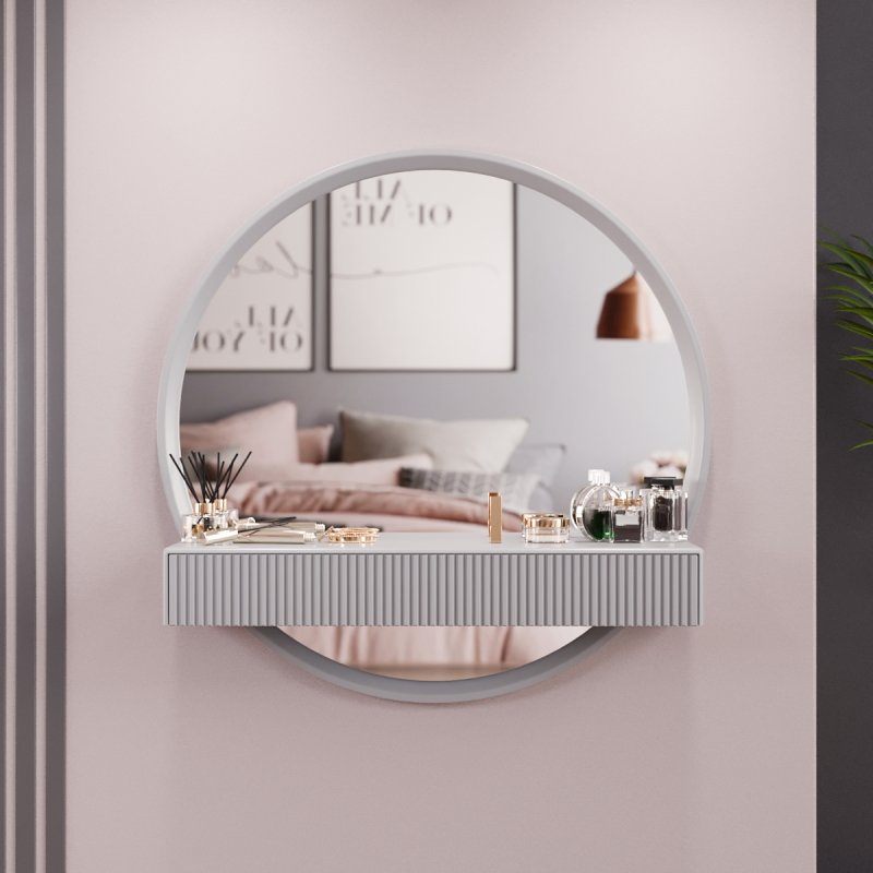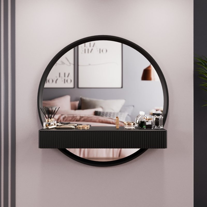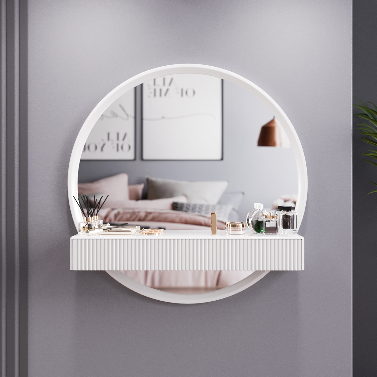 Основа изделия выполнена из крашенного МДФ, тон которого будет легко подобрать под ваш интерьер и цветовую гамму, благодаря восьми вариантам расцветки. Мы включили как “нюдовые” так и красочные тона, в том числе классический белый и строгий черный. Ширина столика пропорциональна диаметру зеркала и позволяет разместить на нём массу вещей и элементов декора.