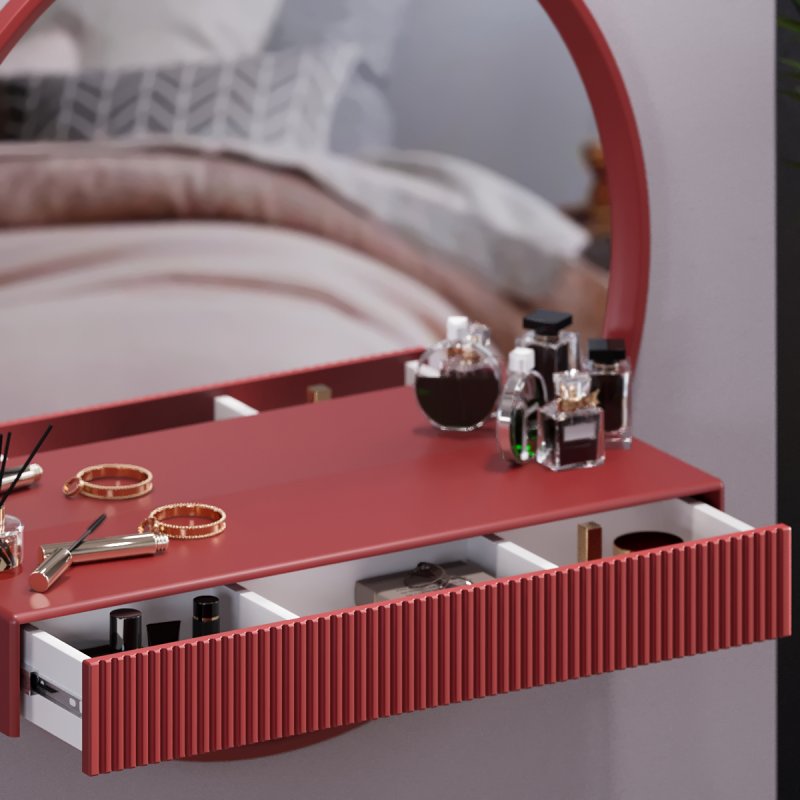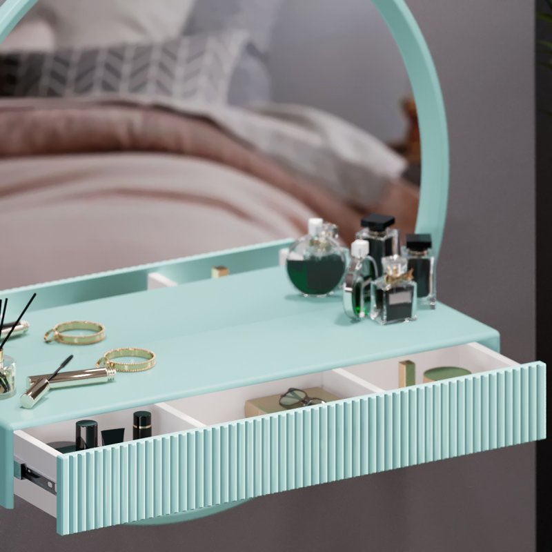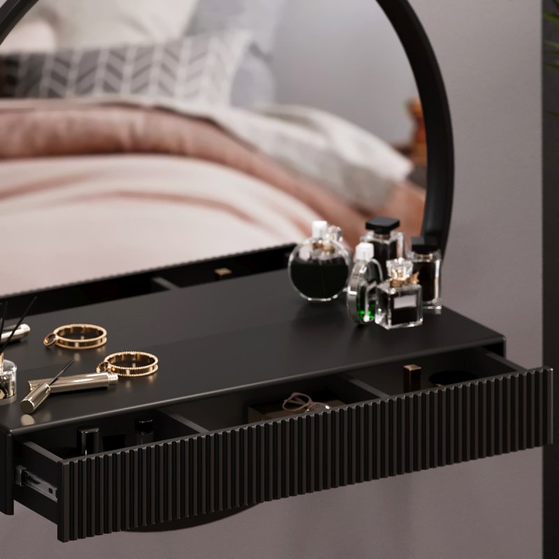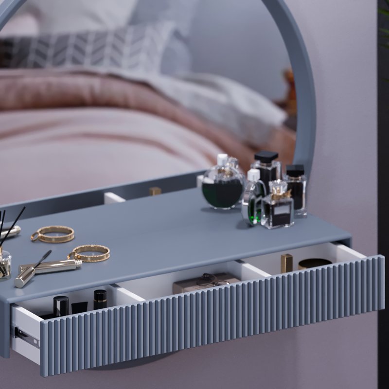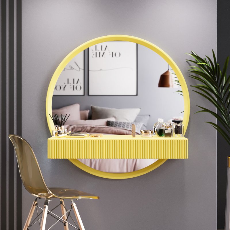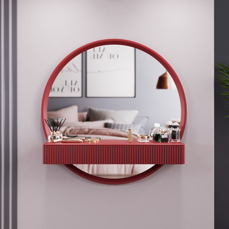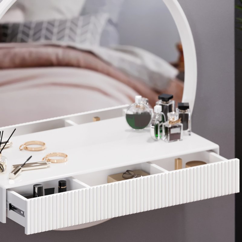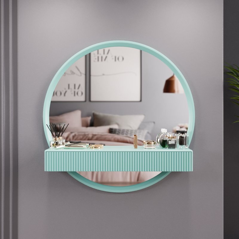Основа изделия выполнена из крашенного МДФ, тон которого будет легко подобрать под ваш интерьер и цветовую гамму, благодаря восьми вариантам расцветки. Мы включили как “нюдовые” так и красочные тона, в том числе классический белый и строгий черный. Ширина столика пропорциональна диаметру зеркала и позволяет разместить на нём массу вещей и элементов декора.