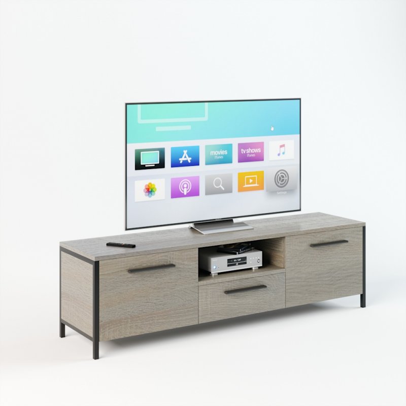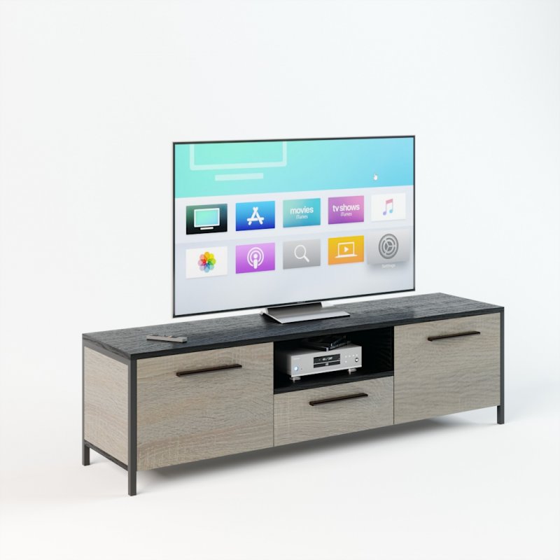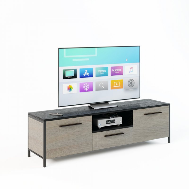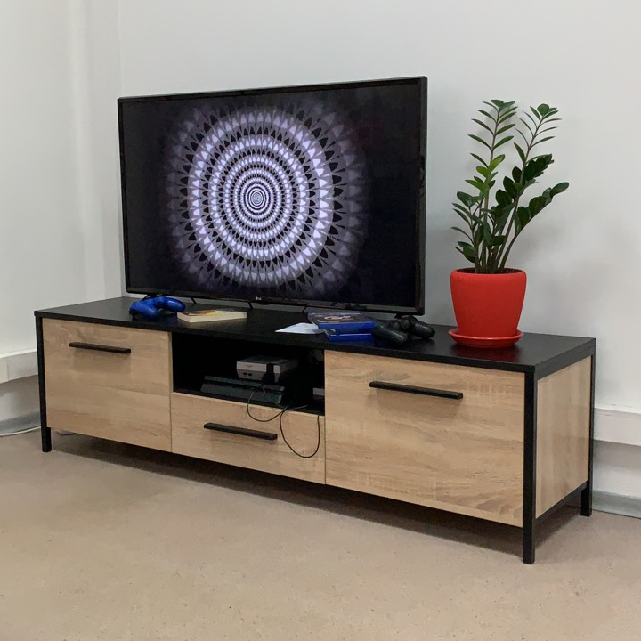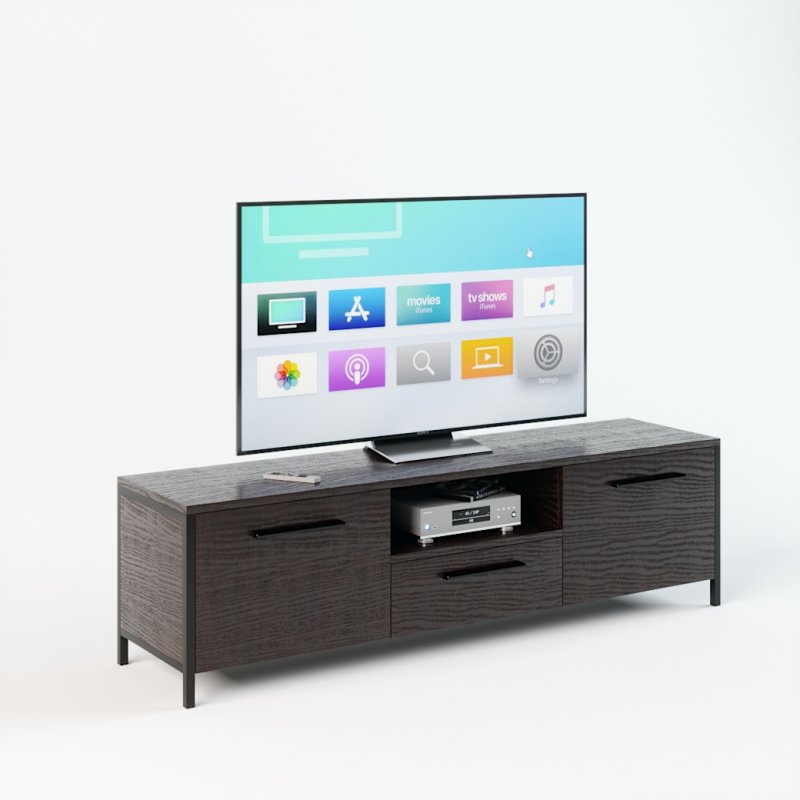Модель предполагает наличие двух высоких открывающихся секций по бокам, в которых можно сложить различные бытовые мелочи, и ящика с нишей по центру. Данное изделие – это красивый и удобный способ организовать комфортное хранение вашей техники. Мощная и устойчивая на плоскости конструкция обеспечит надежное положение вашему телевизору.